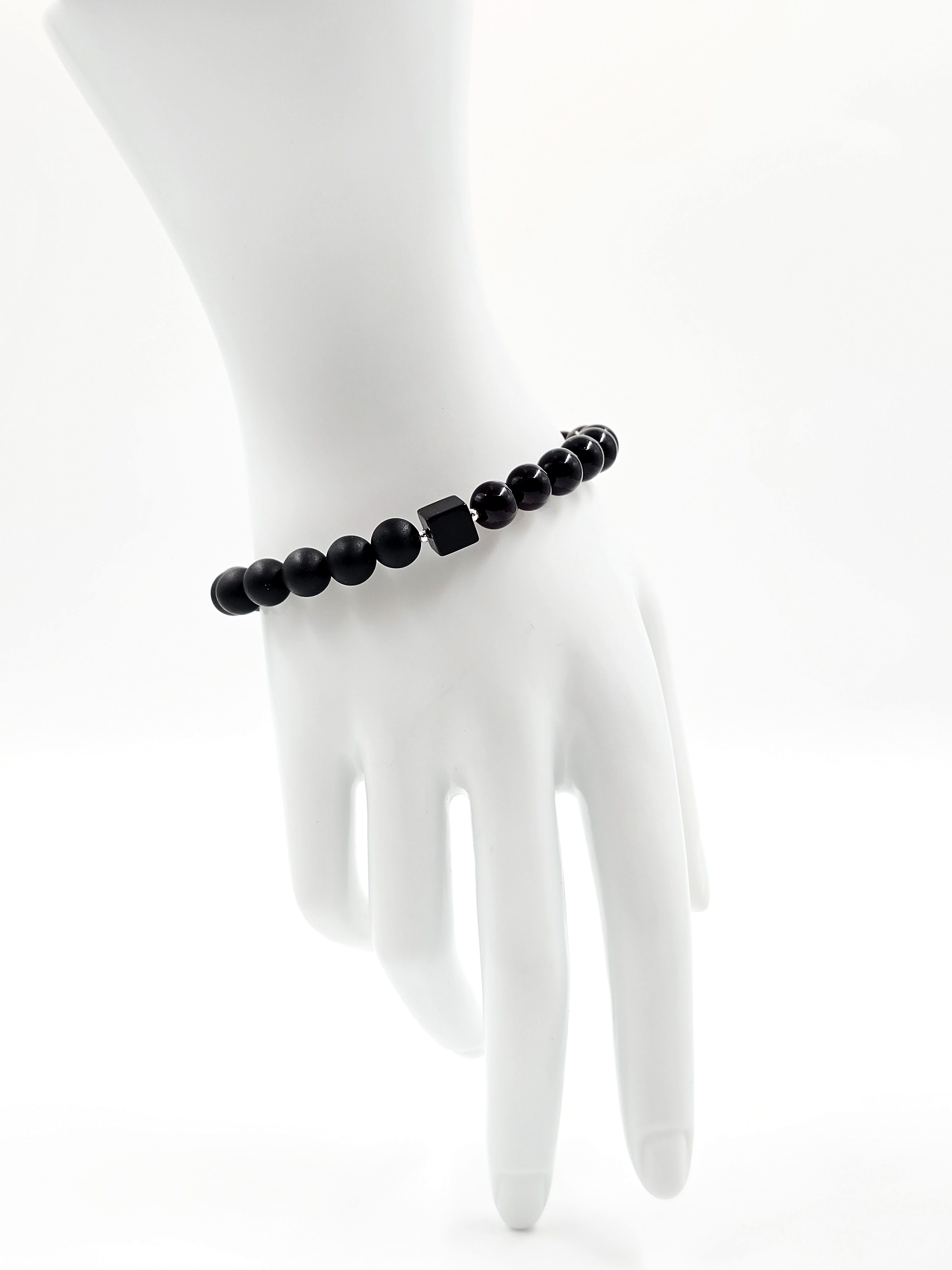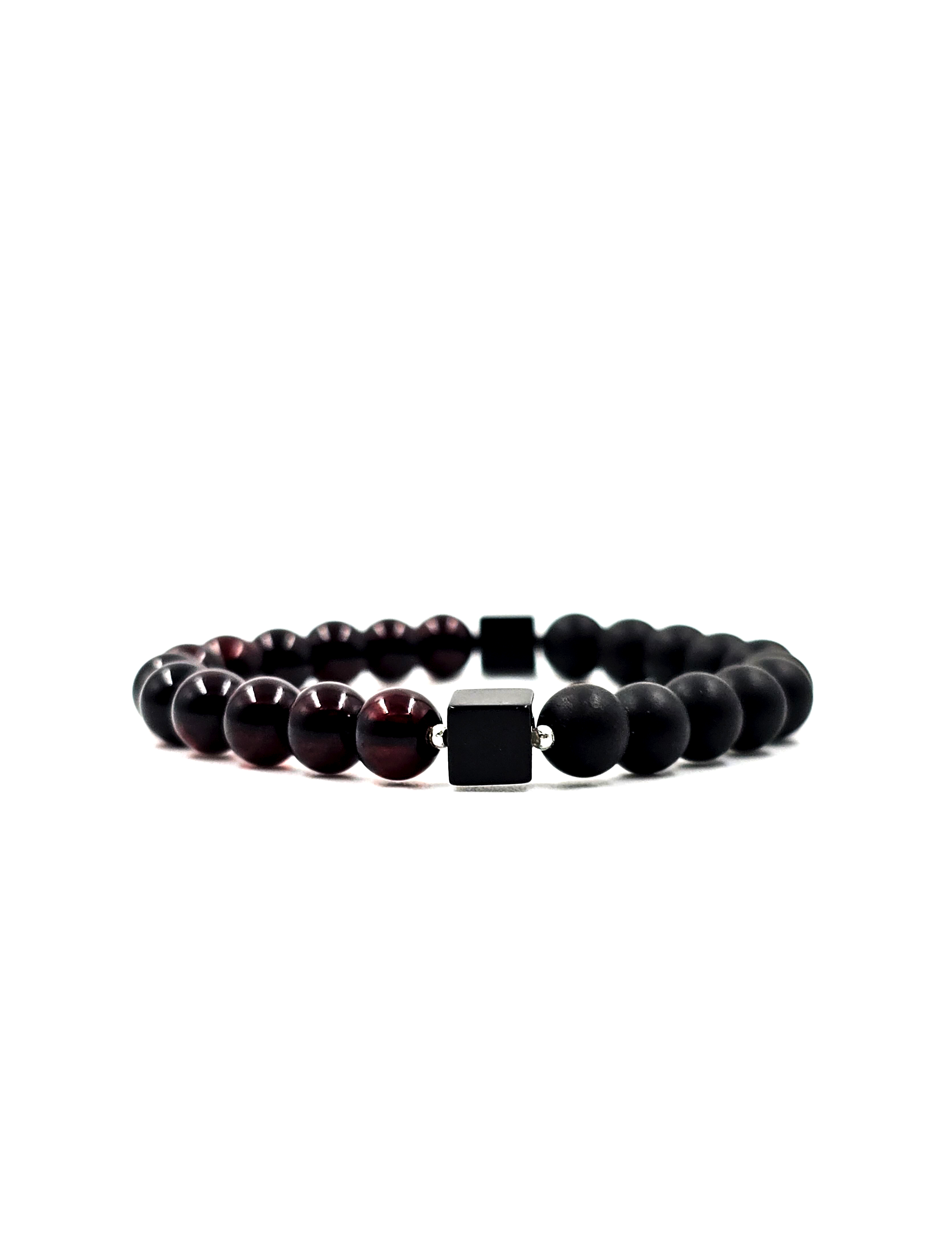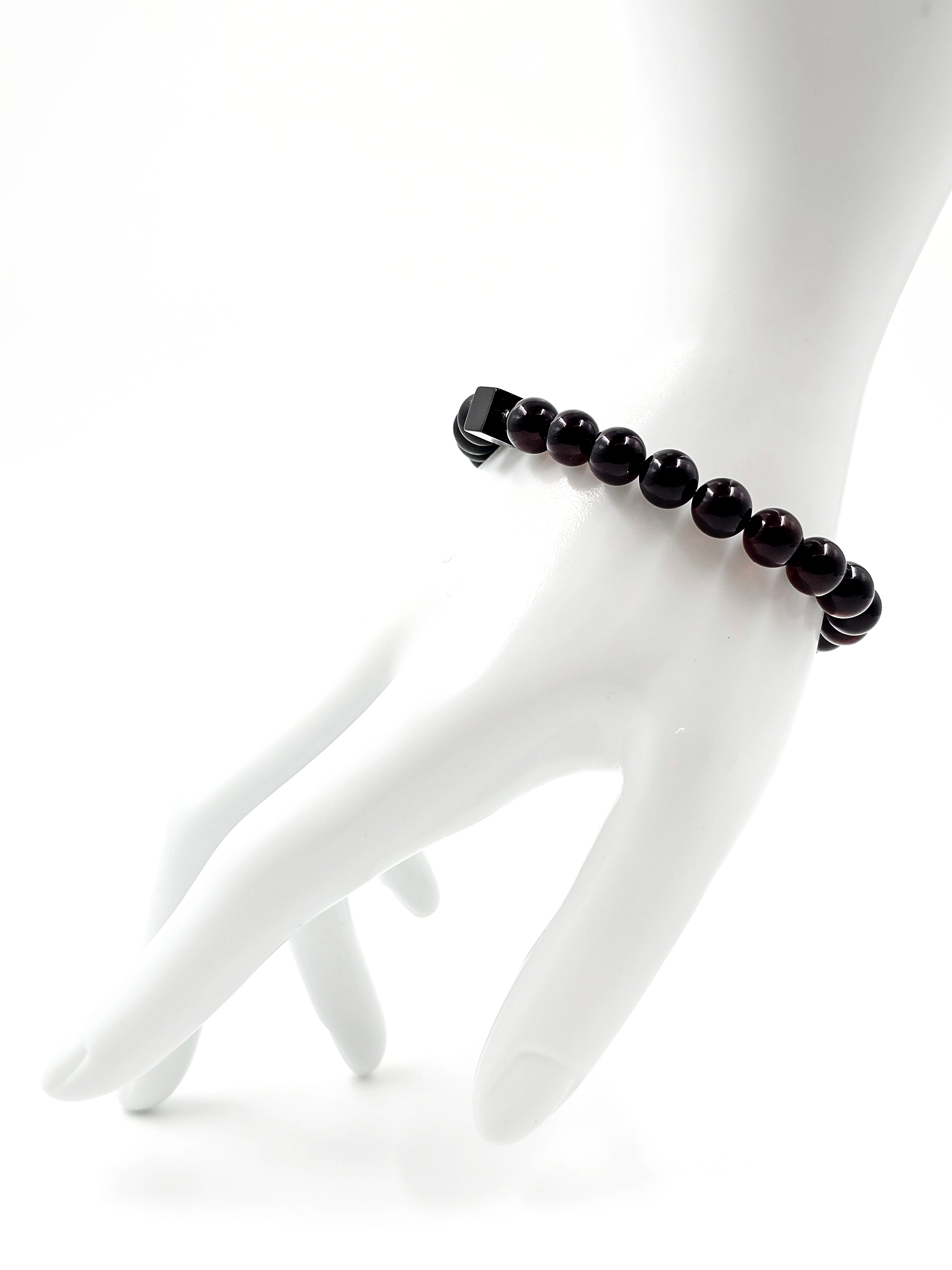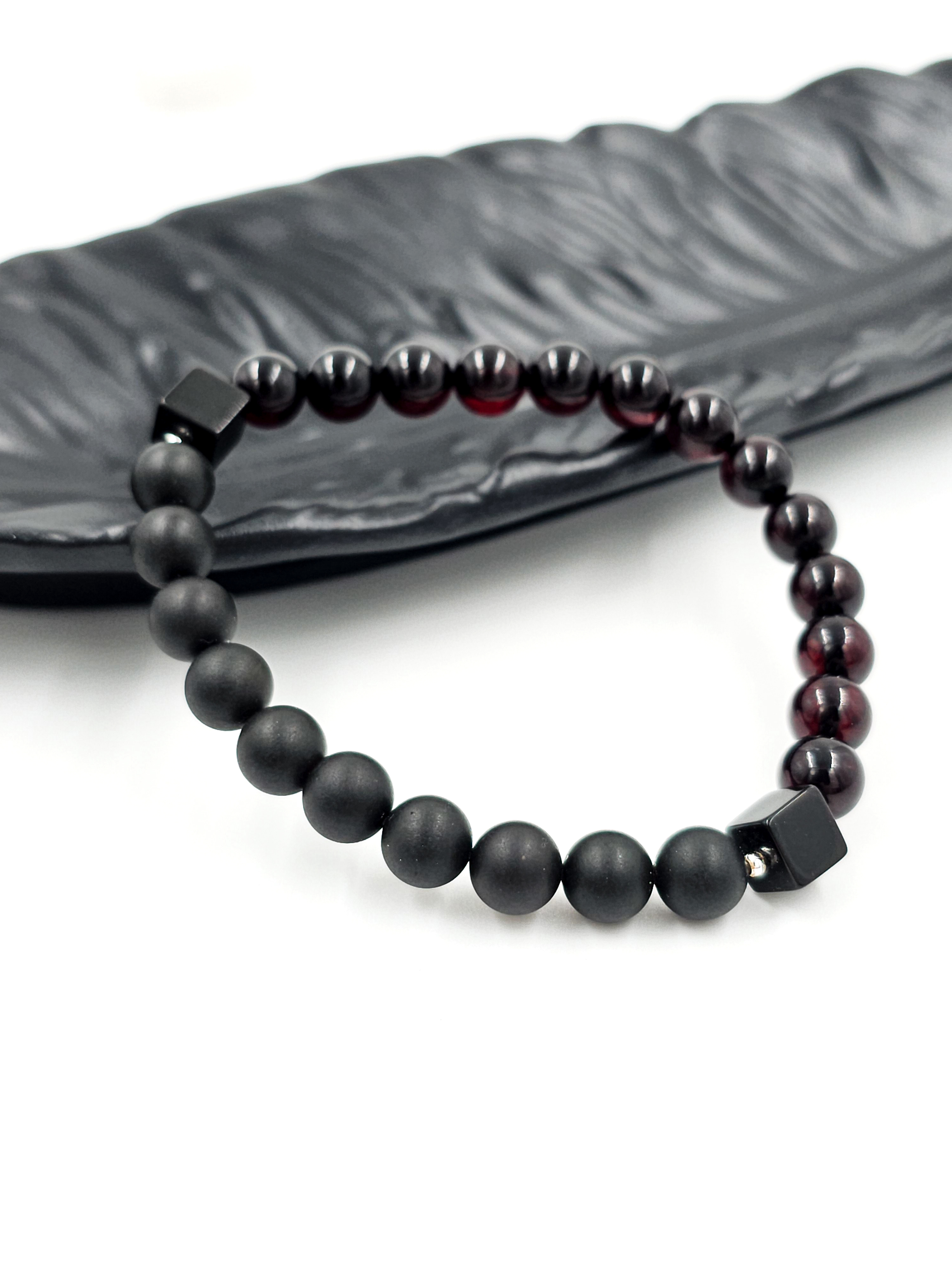 Основные компоненты этого браслета – это матовые темные бусины чёрного оттенка и полированные темно-вишнёвые бусины. Янтарь, из которого они изготовлены, прошёл специальную обработку, что позволяет ему сохранить все природные качества и текстуру. Матовые бусины не подвергались дополнительной полировке, а темно-вишневые бусины прошли этот этап, что придаёт им уникальный глянец.
