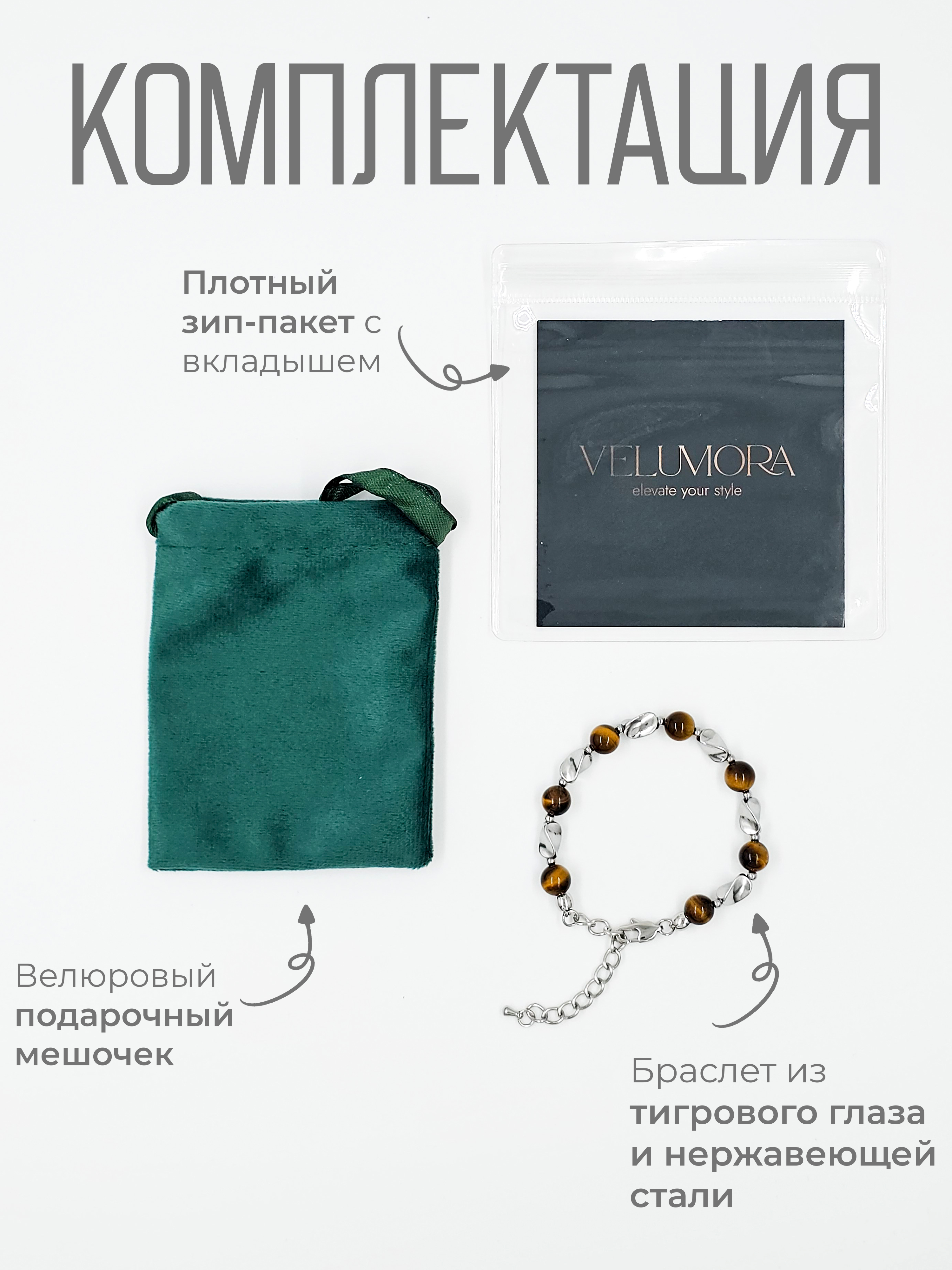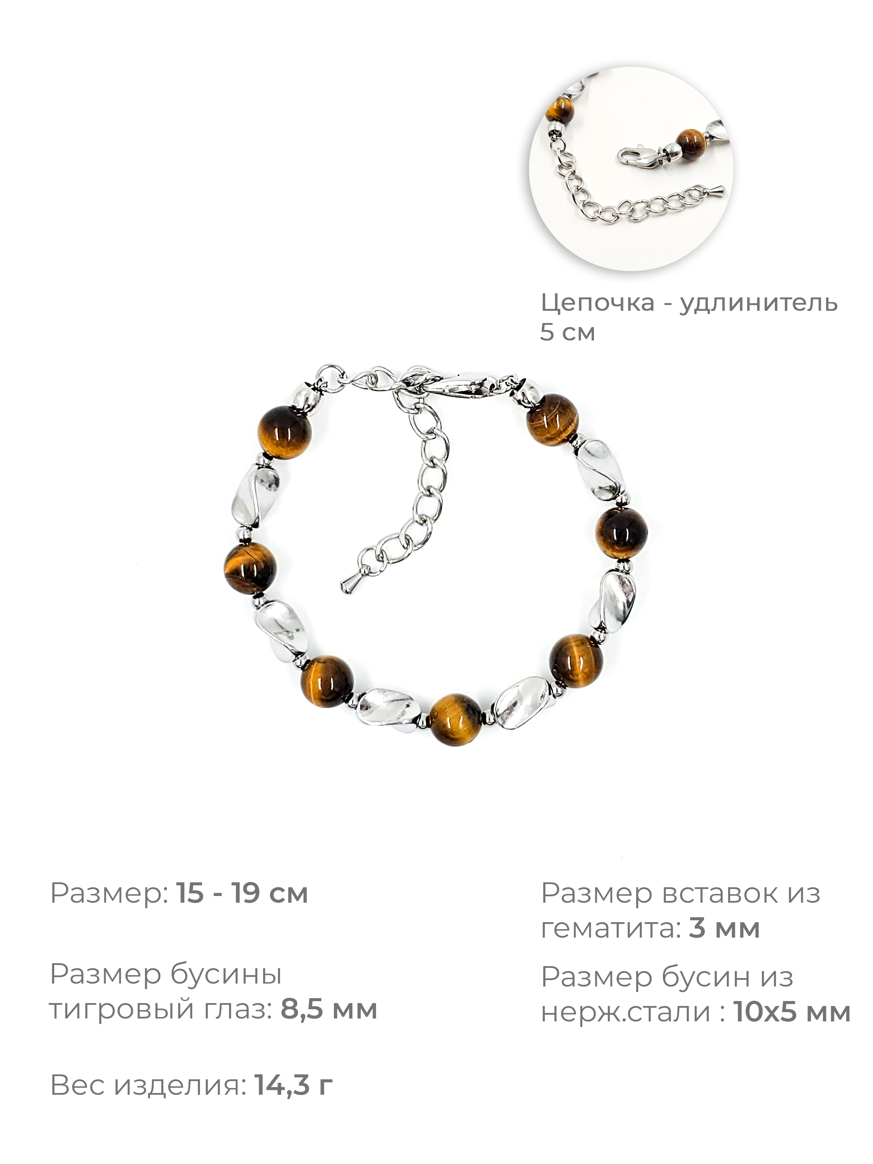 Фурнитура браслета выполнена из нержавеющей стали. Этот материал устойчивый к потемнению, благодаря чему браслет долго сохраняет свой первоначальный вид. Бусины стали в размере 5,5 × 10 мм необычной формы добавляют изделию современный акцент, а вставки из гематита диаметром 3 мм подчеркивают глубину цвета тигрового глаза, создавая гармоничный контраст.