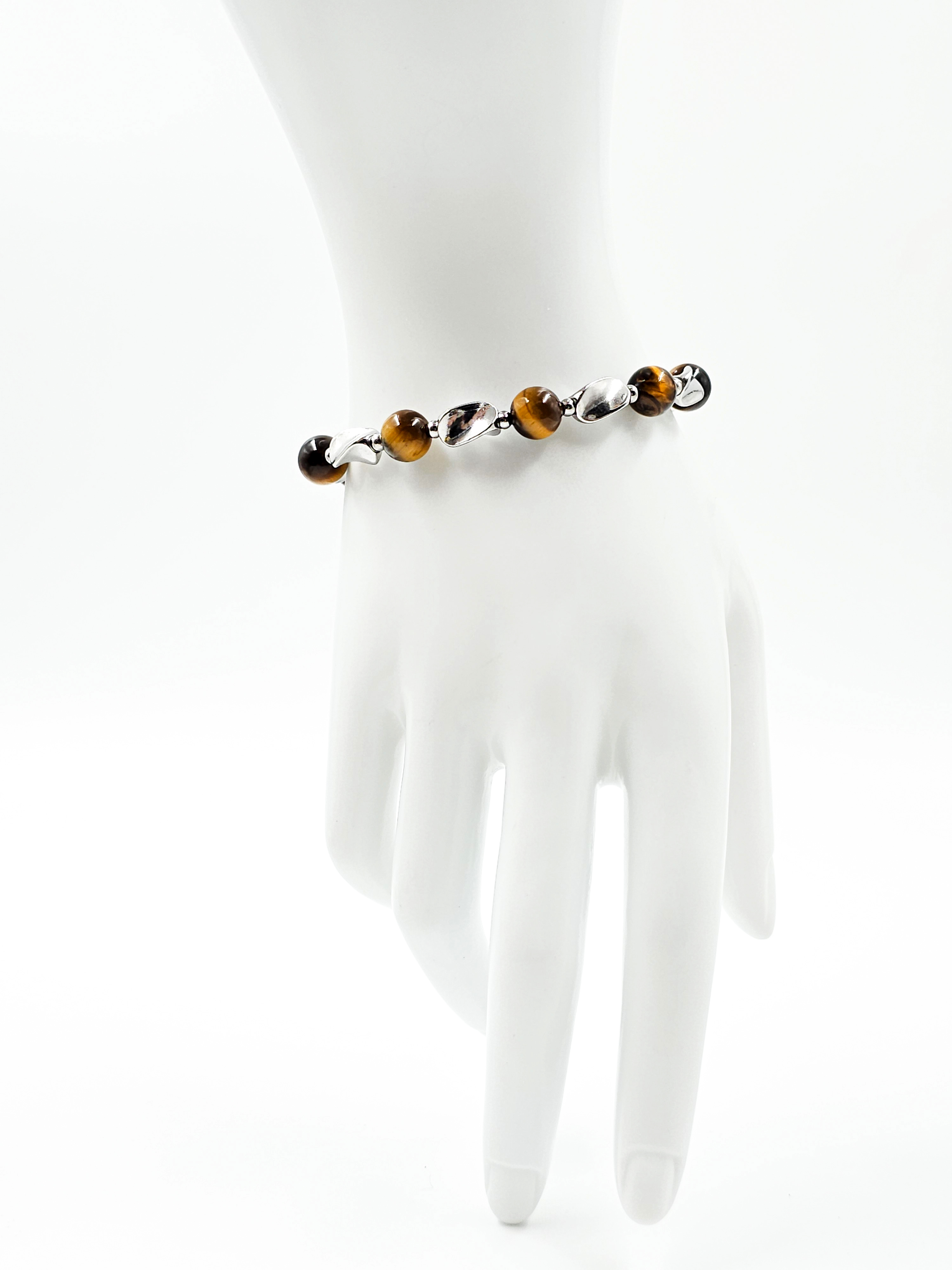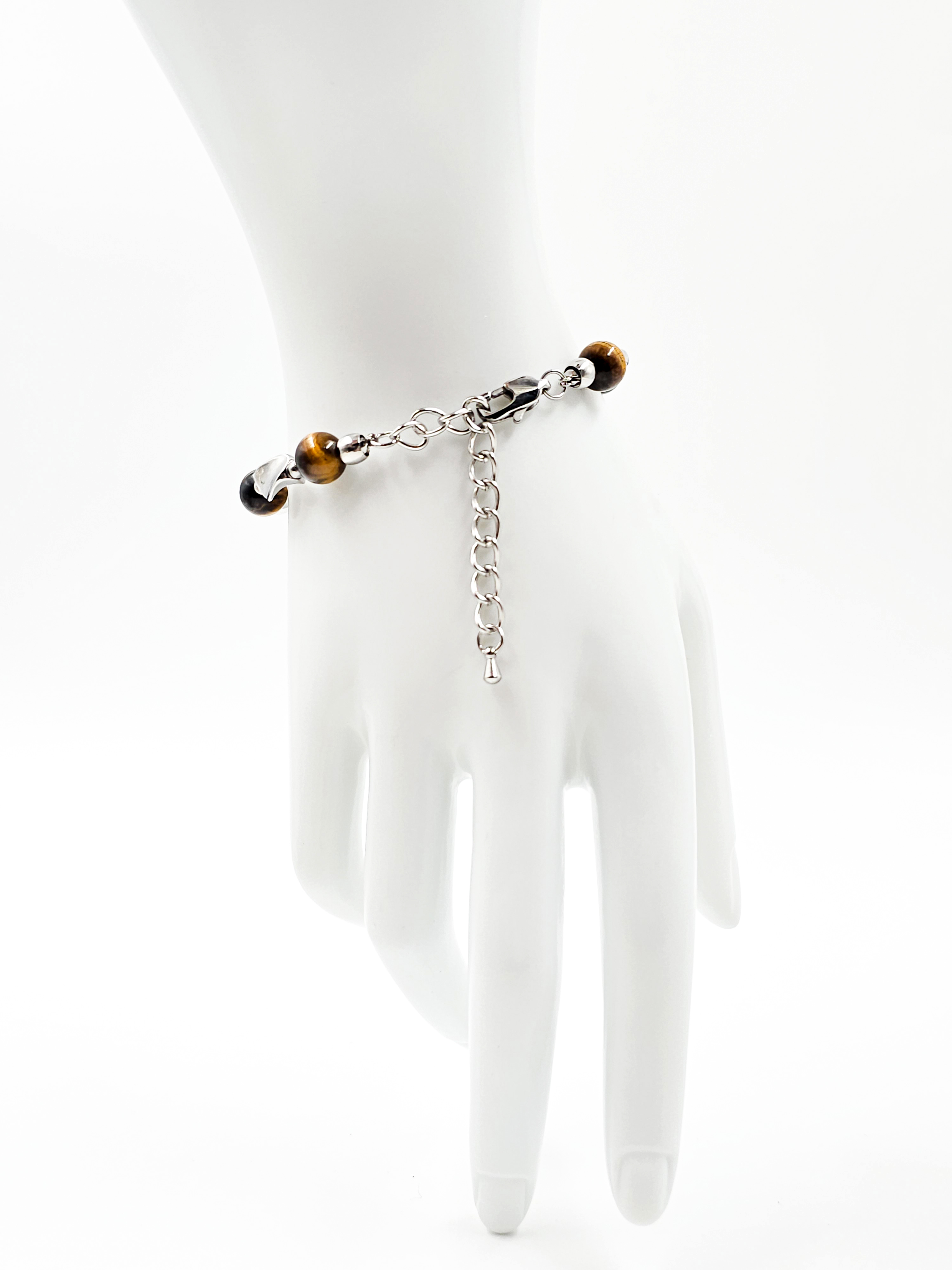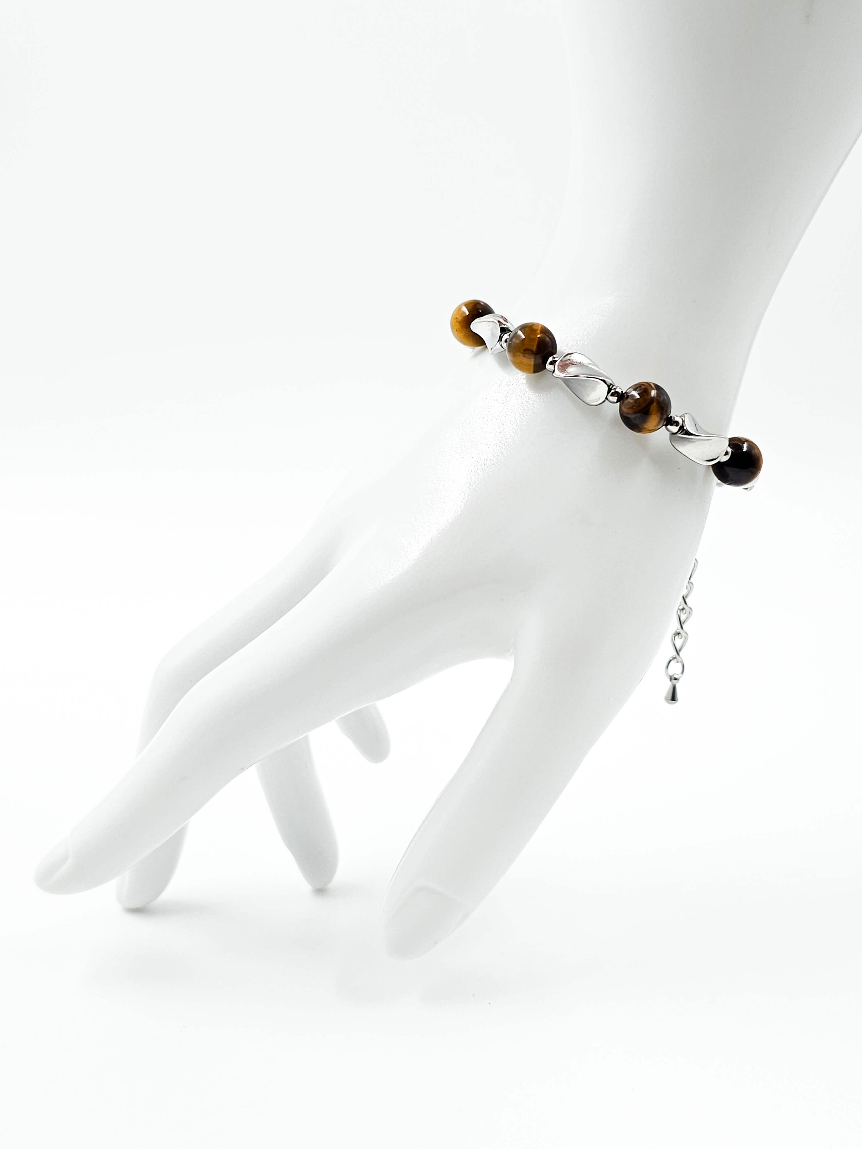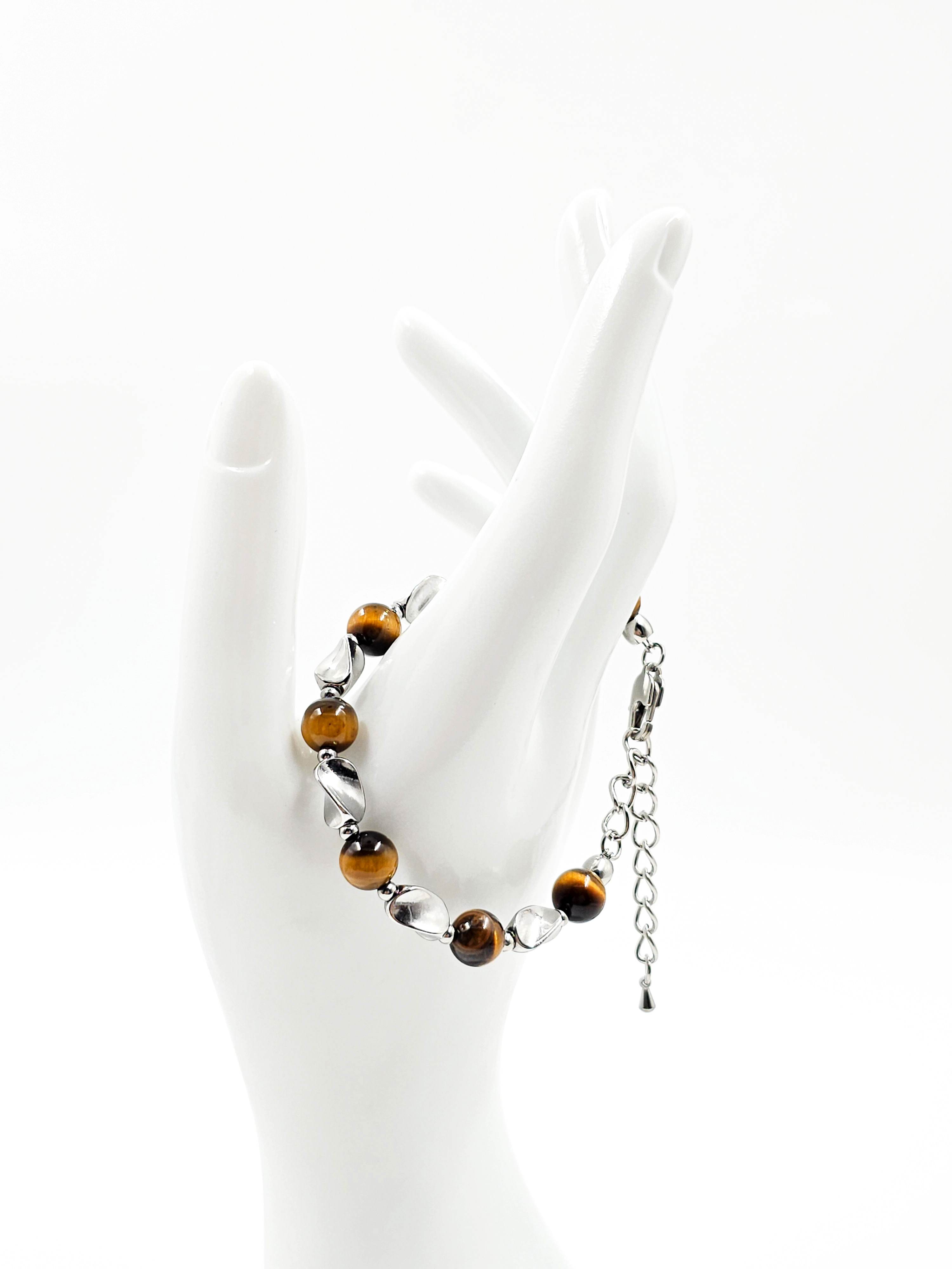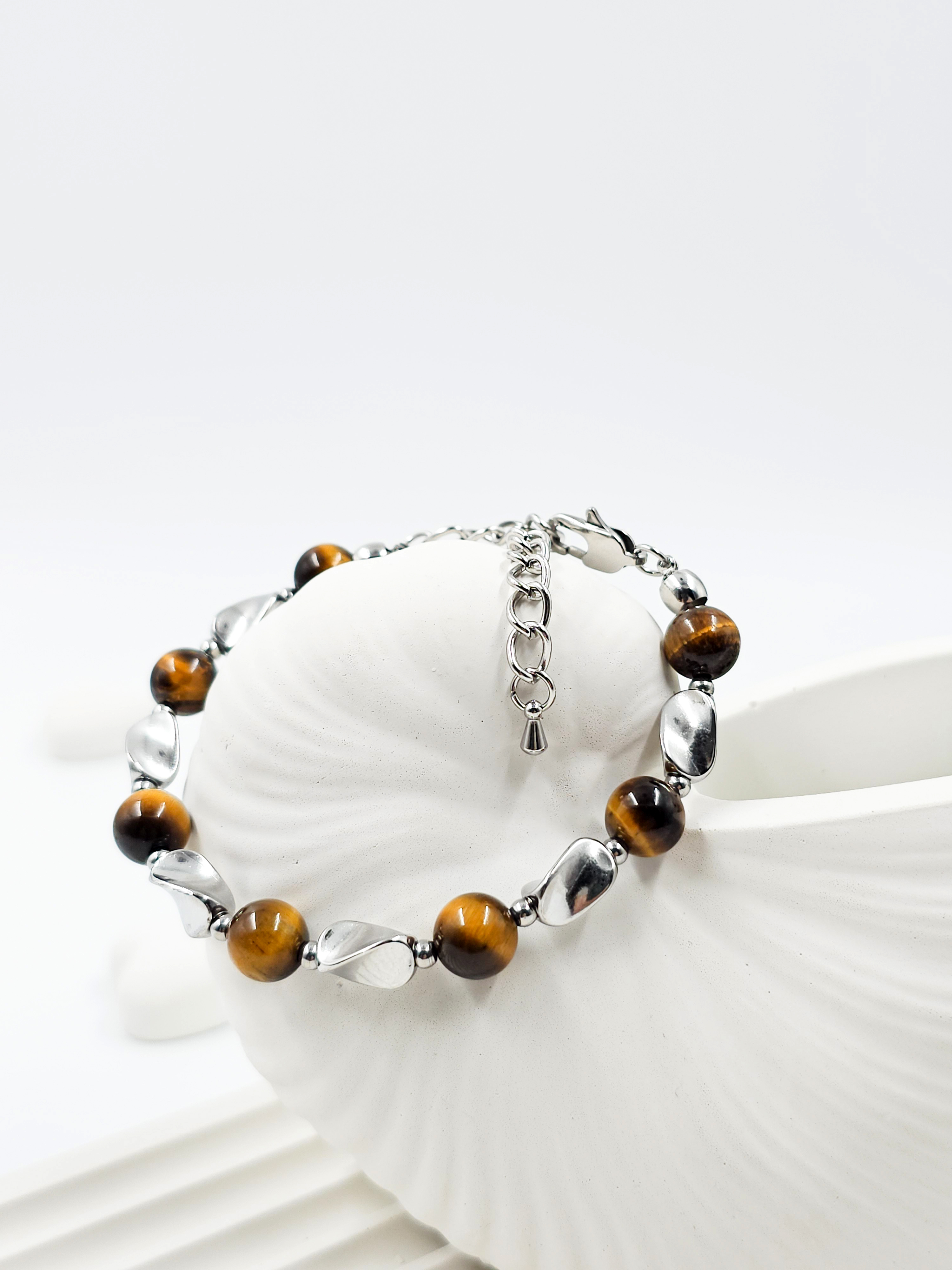 Женский браслет из камня тигровый глаз и нержавеющей стали — это стильное украшение, созданное для тех, кто ценит гармонию природных материалов и современного дизайна. Бусины натурального тигрового глаза диаметром 8,5 мм. Этот камень известен своей выразительной текстурой: его золотисто-коричневые переливы словно оживают при свете, создавая эффект «кошачьего глаза». Каждая бусина уникальна и хранит в себе природную энергетику.
