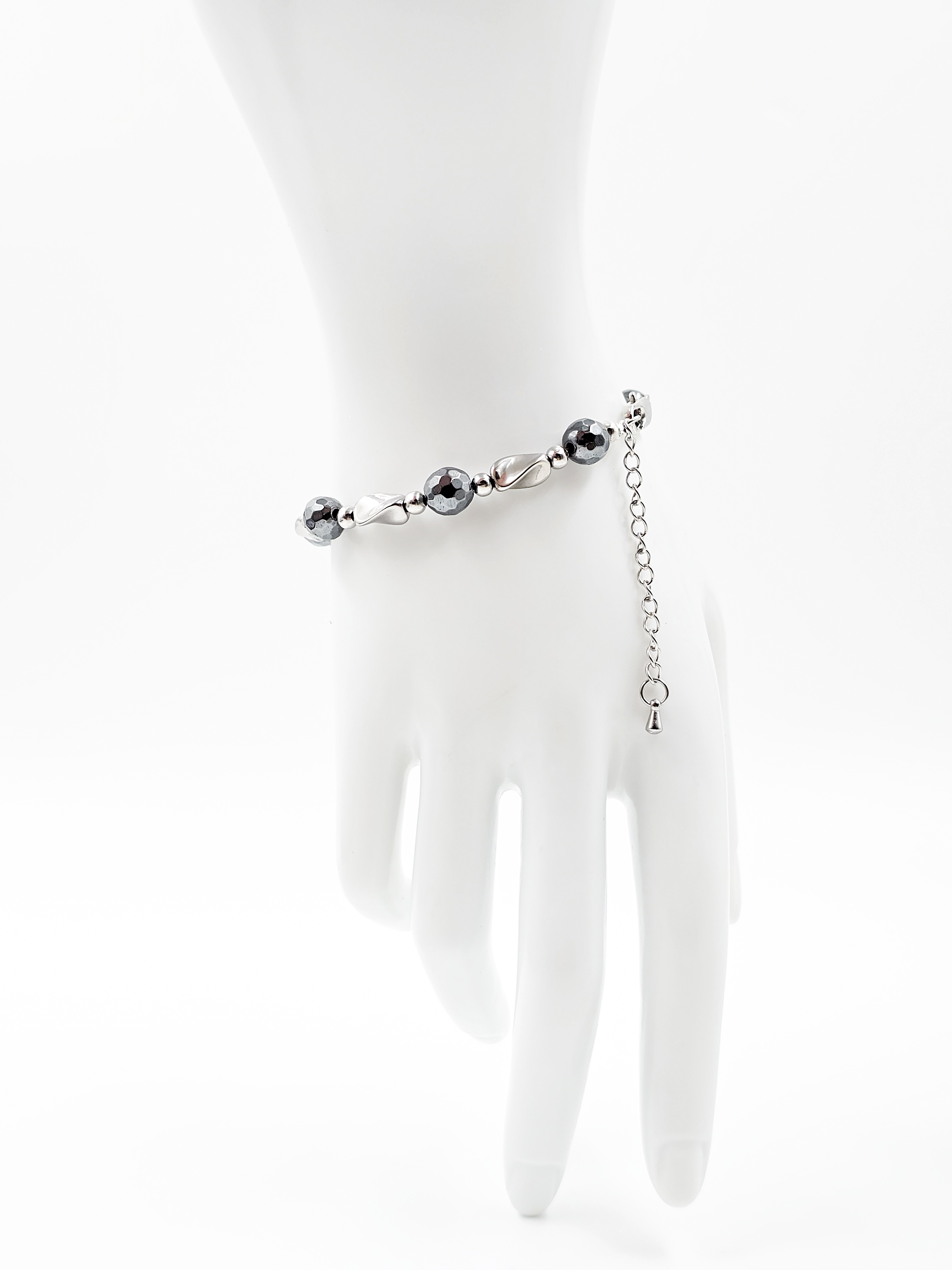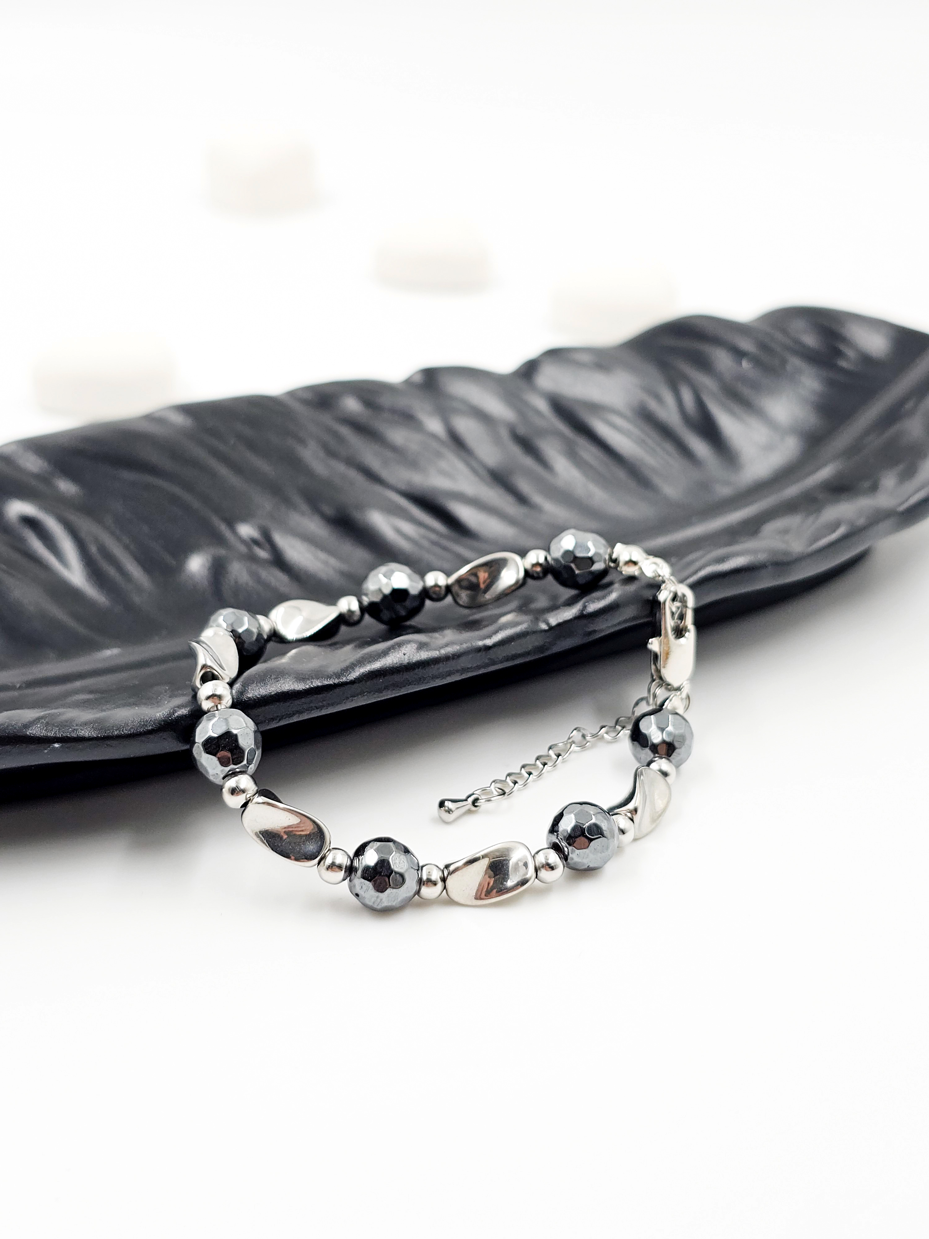 Браслет женский на руку из гематита и нержавеющей стали — это стильное и универсальное украшение, подходящее как для повседневного использования, так и для делового стиля. Украшение собрано из бусин прессованного гематита и нержавеющей стали, что делает его одновременно изящным и практичным. Прессованный гематит легче по весу, чем цельный минерал, и позволяет придавать бусинам оригинальную гранёную форму, благодаря чему браслет смотрится особенно выразительно.