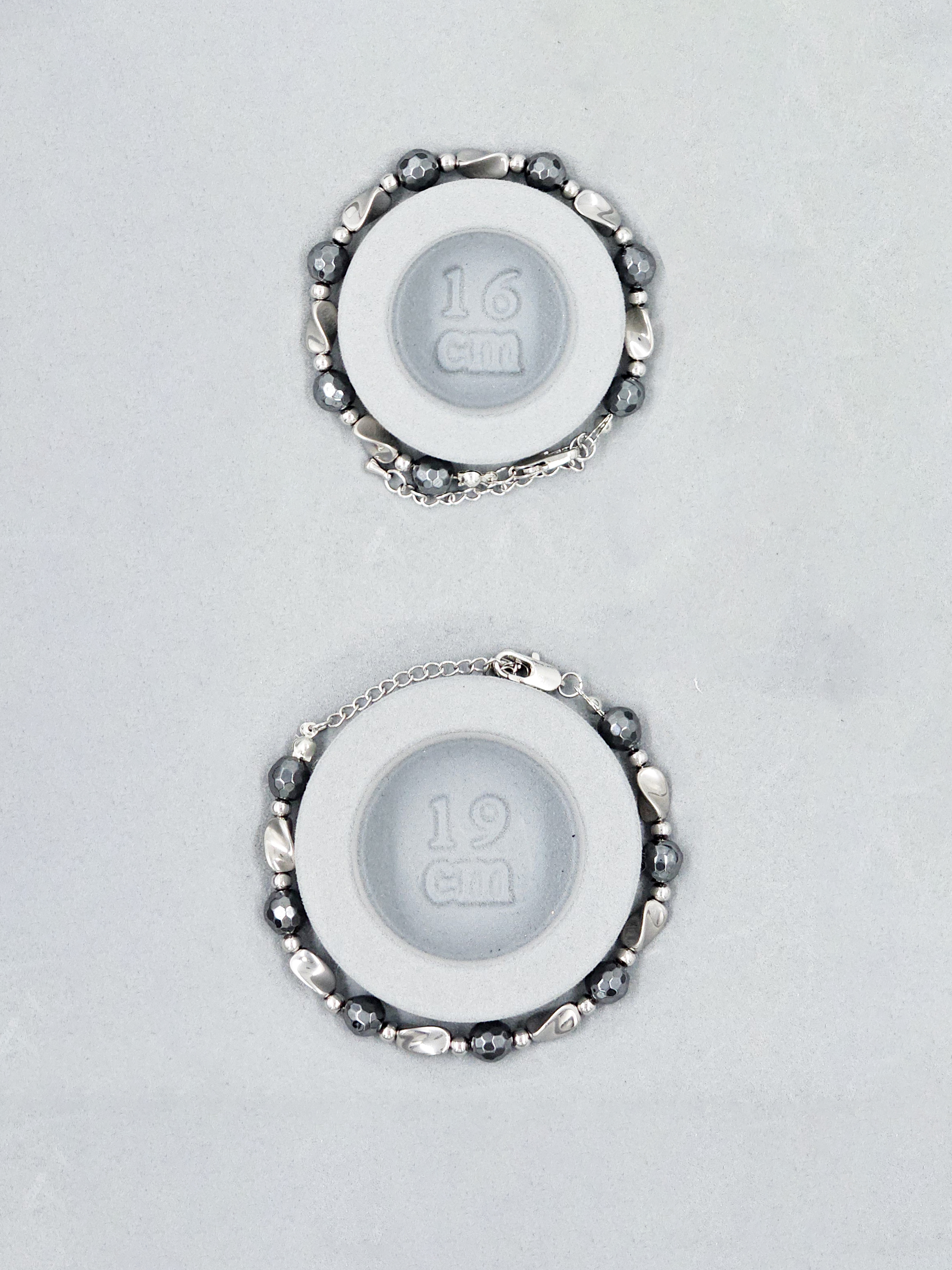 Бусины из прессованного гематита диаметром 7,5 мм и дополнительные вставки 4 мм, которые придают композиции аккуратность и гармонию. Бусины из нержавеющей стали размером 10×5 мм подчеркивают современный стиль украшения, добавляя металлический блеск и визуальный баланс. Общий вес изделия составляет 15,6 г, что делает браслет комфортным в ежедневной носке.