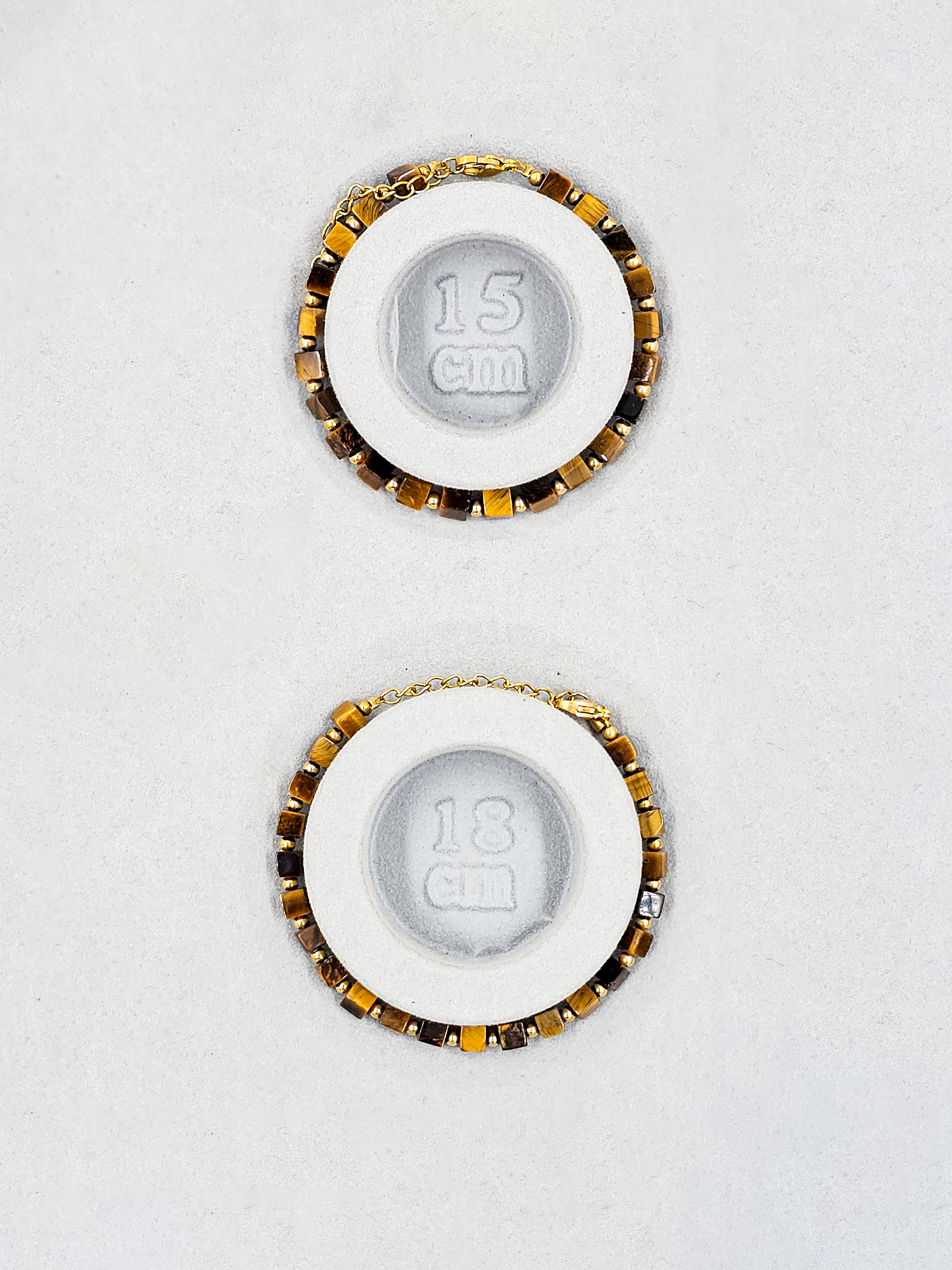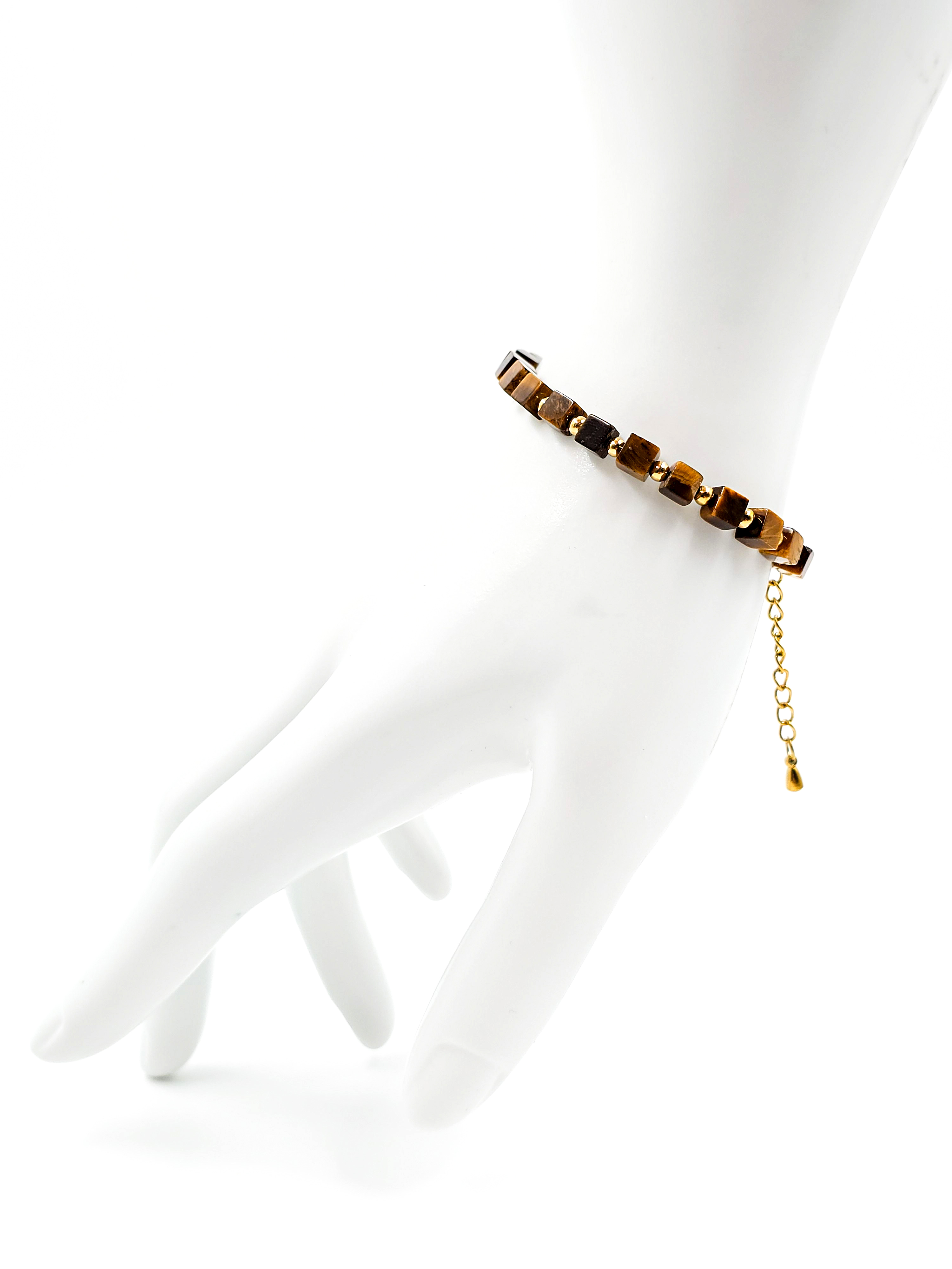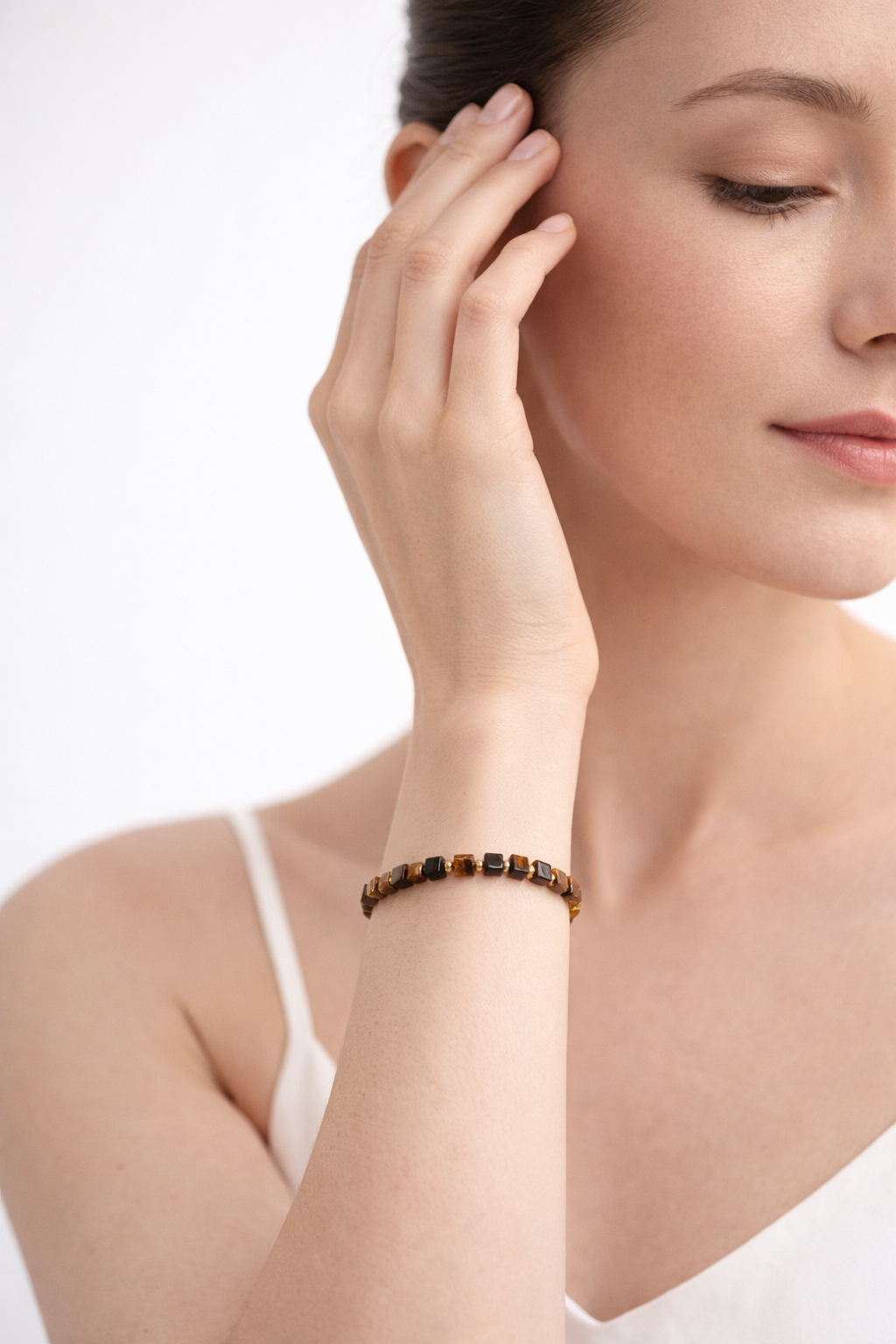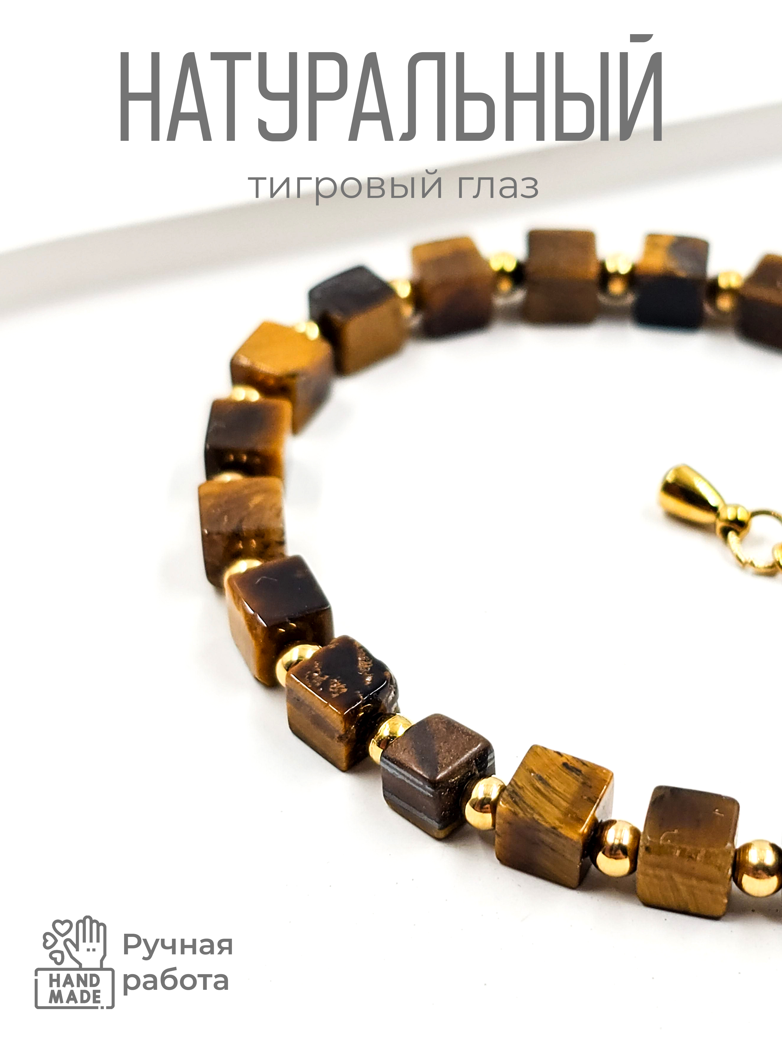 Женский браслет на руку из натурального тигрового глаза — это сочетание природной энергии камня, ручной работы и аккуратного современного дизайна. Украшение создаётся вручную мастерами, поэтому каждая деталь продумана до мелочей. Центральной особенностью браслета являются кубические бусины из тигрового глаза размером 4,5 мм. Они вытачиваются вручную из натурального камня, и именно поэтому могут иметь лёгкую асимметрию граней — это естественная особенность ручной огранки, которая делает каждое украшение уникальным. Тигровый глаз известен как камень силы, уверенности и внутренней устойчивости. Считается, что тигровый глаз поддерживает энергетику человека, усиливает уверенность в себе и помогает достигать поставленных целей. Благодаря характерному «кошачьему» переливу камень выглядит живым и выразительным, а каждая грань отражает природную глубину оттенков — от тёмных насыщенных тонов до светлых золотистых прожилок. Браслет собран на прочной ювелирной проволоке, которая сохраняет форму изделия и обеспечивает надёжность при ежедневной носке. Между камнями размещены латунные спейсеры с позолотой диаметром 3 мм, создающие лёгкие акценты и подчёркивающие природную текстуру тигрового глаза. Для удобной посадки предусмотрена цепочка-удлинитель 3,5 см, благодаря которой браслет легко регулируется и подходит на запястье размером от 15 до 18 см. Натуральный тигровый глаз — природный материал, поэтому оттенок камней может немного отличаться от фотографий. Возможны небольшие включения, микротрещины или природные особенности структуры — именно они подтверждают подлинность камня и делают каждое изделие неповторимым. Соблюдайте рекомендации по эксплуатации и уходу, избегайте длительного контакта украшения с водой и химическими веществами — и браслет из натурального камня тигровый глаз будет радовать своим блеском и энергией долгие годы.