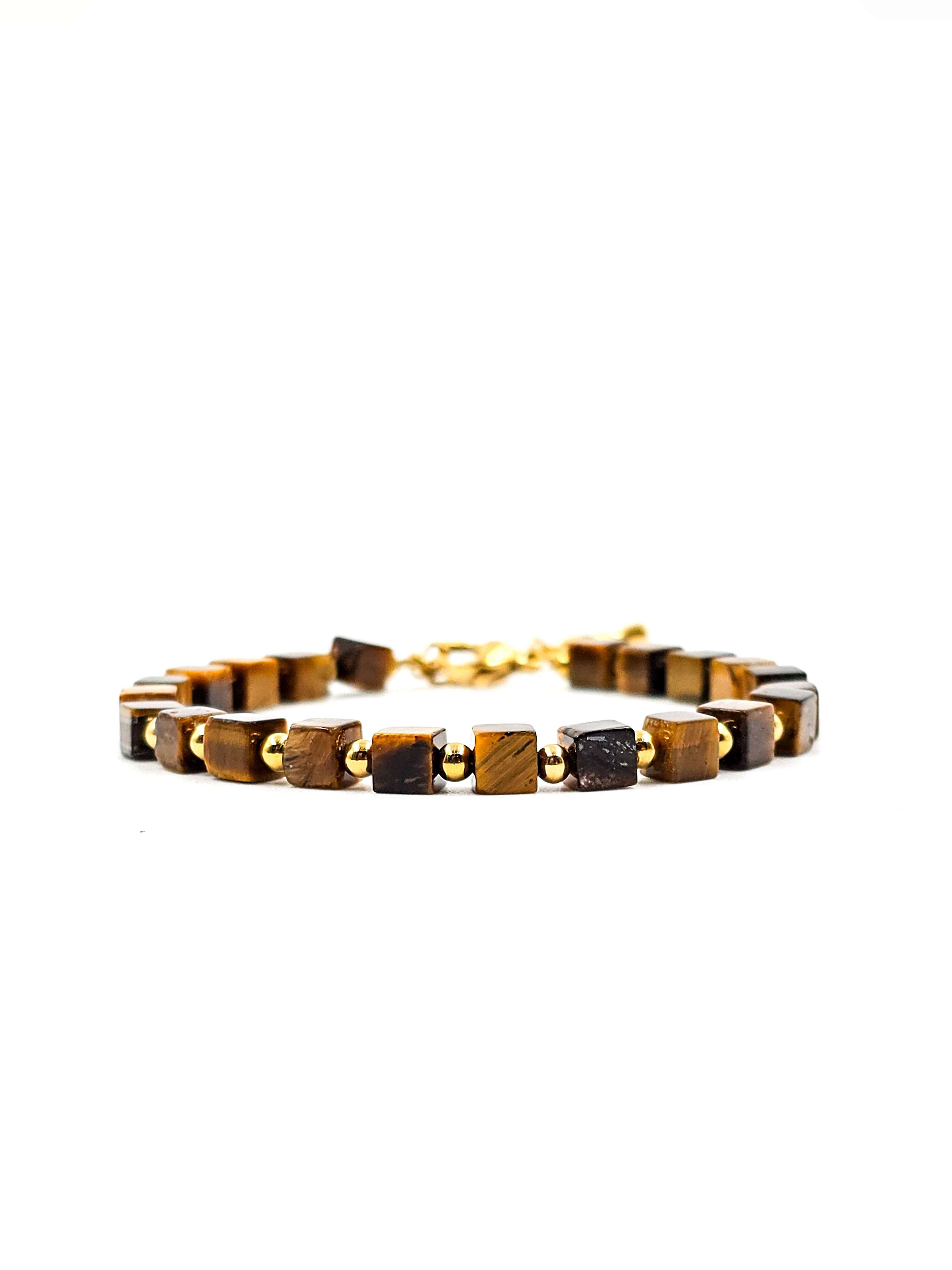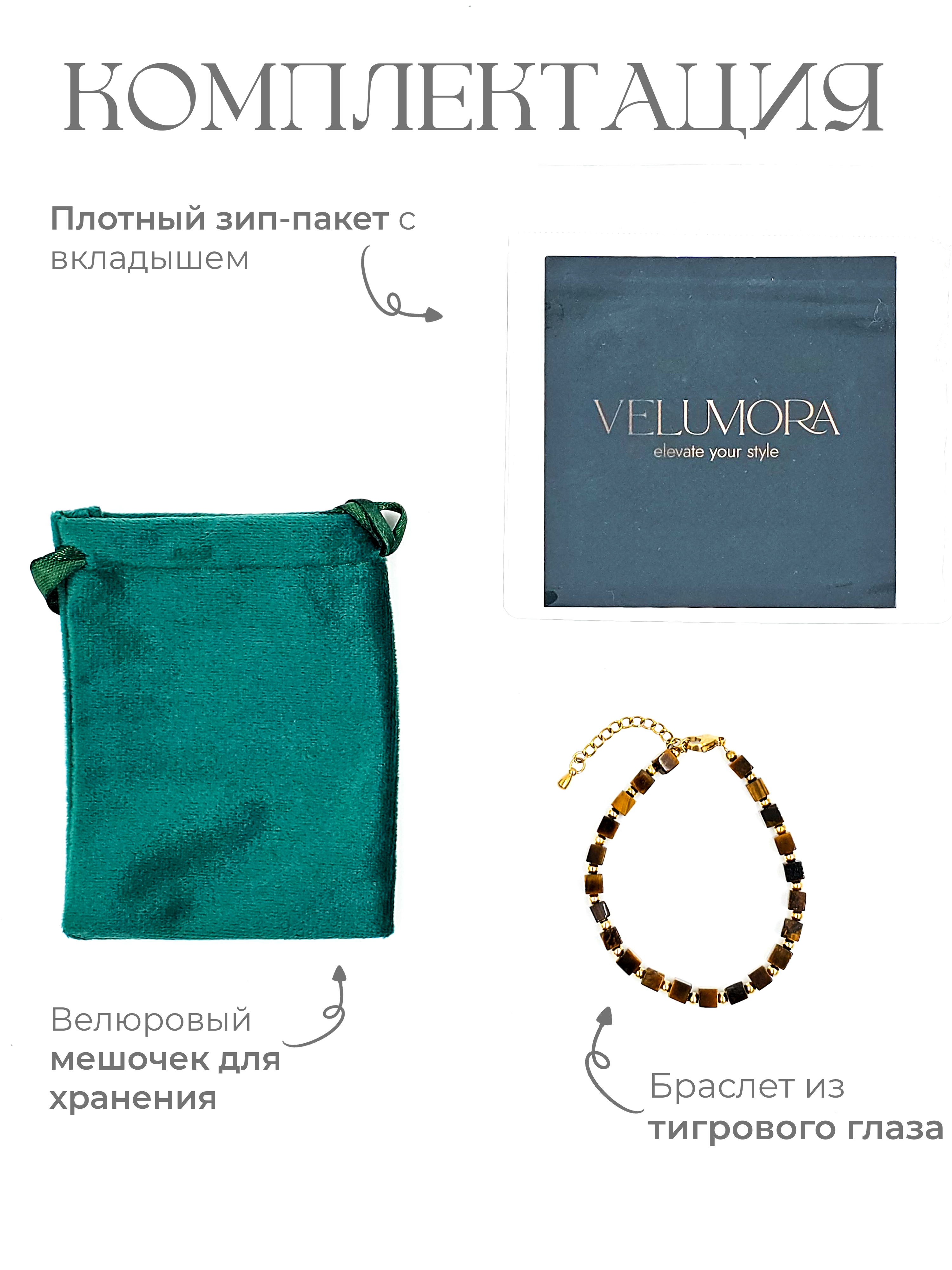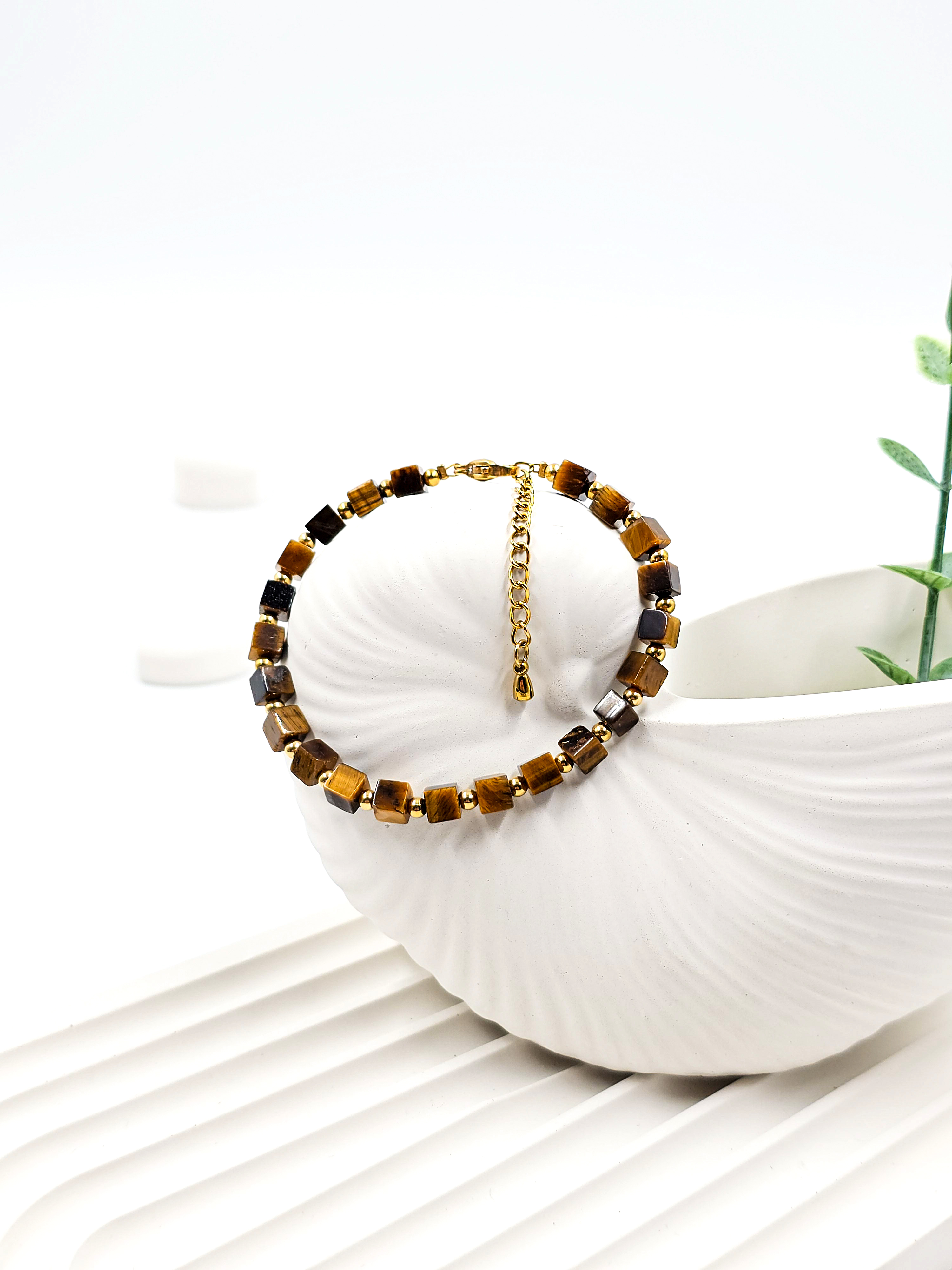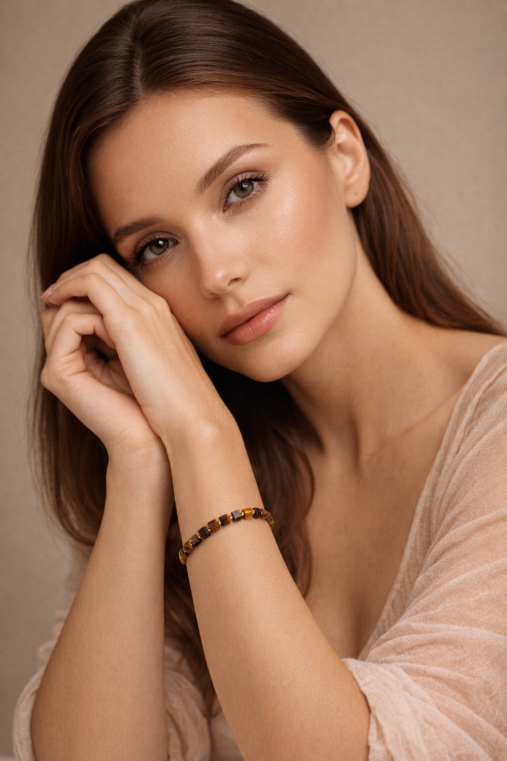 Женский браслет на руку из натурального тигрового глаза — это сочетание природной энергии камня, ручной работы и аккуратного современного дизайна. Украшение создаётся вручную мастерами, поэтому каждая деталь продумана до мелочей. Центральной особенностью браслета являются кубические бусины из тигрового глаза размером 4,5 мм. Они вытачиваются вручную из натурального камня, и именно поэтому могут иметь лёгкую асимметрию граней — это естественная особенность ручной огранки, которая делает каждое украшение уникальным. Тигровый глаз известен как камень силы, уверенности и внутренней устойчивости. Считается, что тигровый глаз поддерживает энергетику человека, усиливает уверенность в себе и помогает достигать поставленных целей. Благодаря характерному «кошачьему» переливу камень выглядит живым и выразительным, а каждая грань отражает природную глубину оттенков — от тёмных насыщенных тонов до светлых золотистых прожилок. Браслет собран на прочной ювелирной проволоке, которая сохраняет форму изделия и обеспечивает надёжность при ежедневной носке. Между камнями размещены латунные спейсеры с позолотой диаметром 3 мм, создающие лёгкие акценты и подчёркивающие природную текстуру тигрового глаза. Для удобной посадки предусмотрена цепочка-удлинитель 3,5 см, благодаря которой браслет легко регулируется и подходит на запястье размером от 15 до 18 см. Натуральный тигровый глаз — природный материал, поэтому оттенок камней может немного отличаться от фотографий. Возможны небольшие включения, микротрещины или природные особенности структуры — именно они подтверждают подлинность камня и делают каждое изделие неповторимым. Соблюдайте рекомендации по эксплуатации и уходу, избегайте длительного контакта украшения с водой и химическими веществами — и браслет из натурального камня тигровый глаз будет радовать своим блеском и энергией долгие годы.
