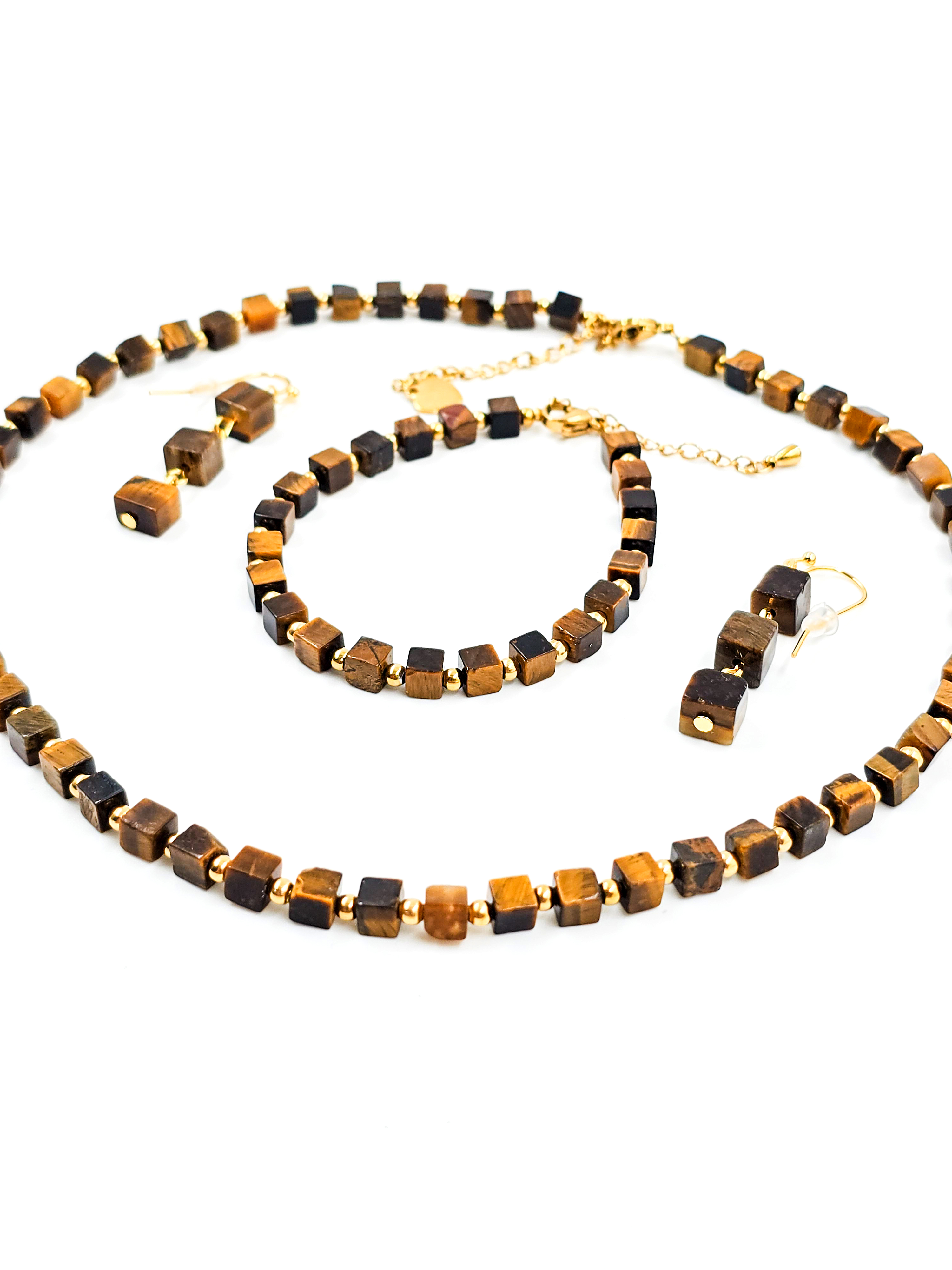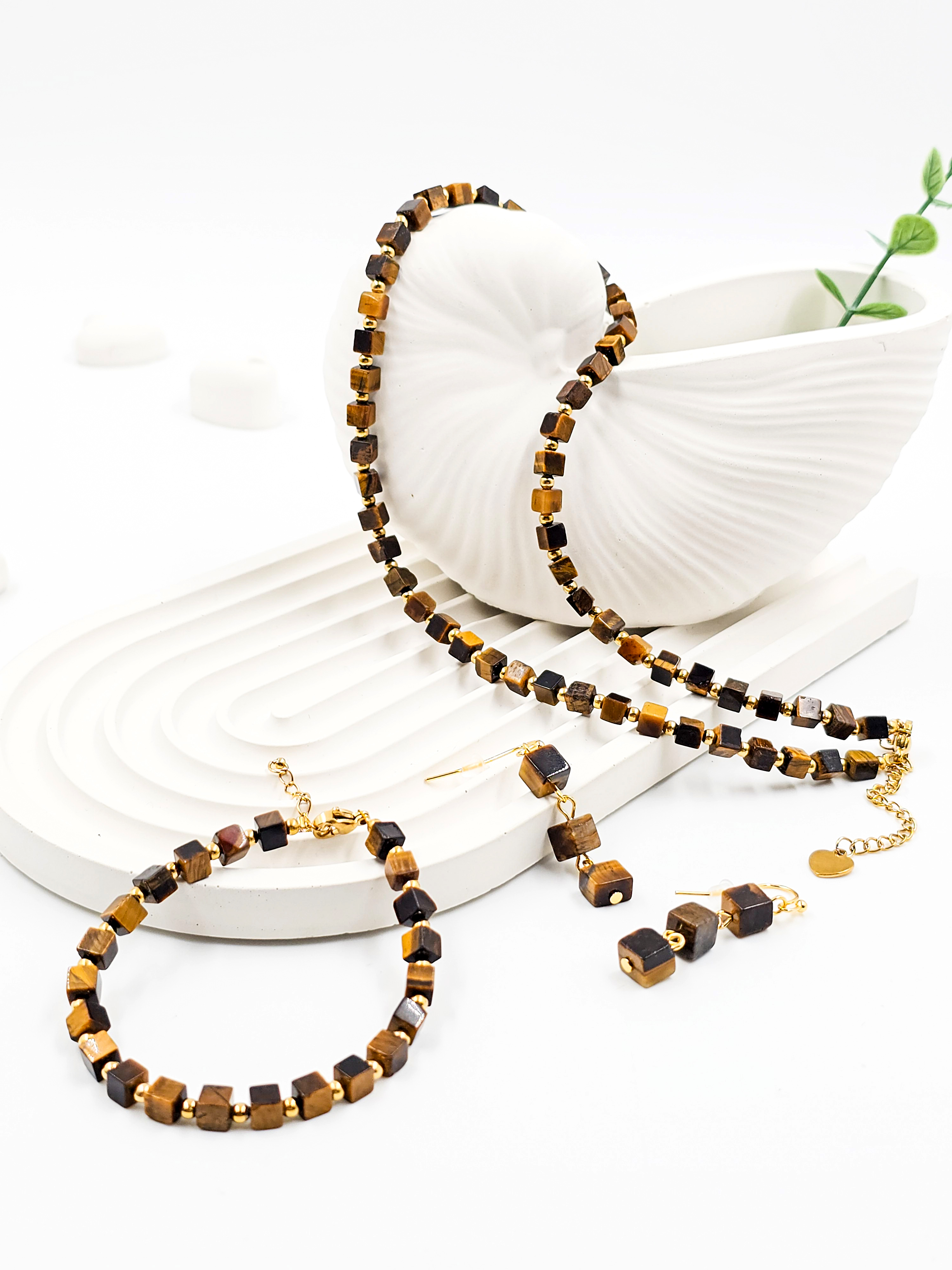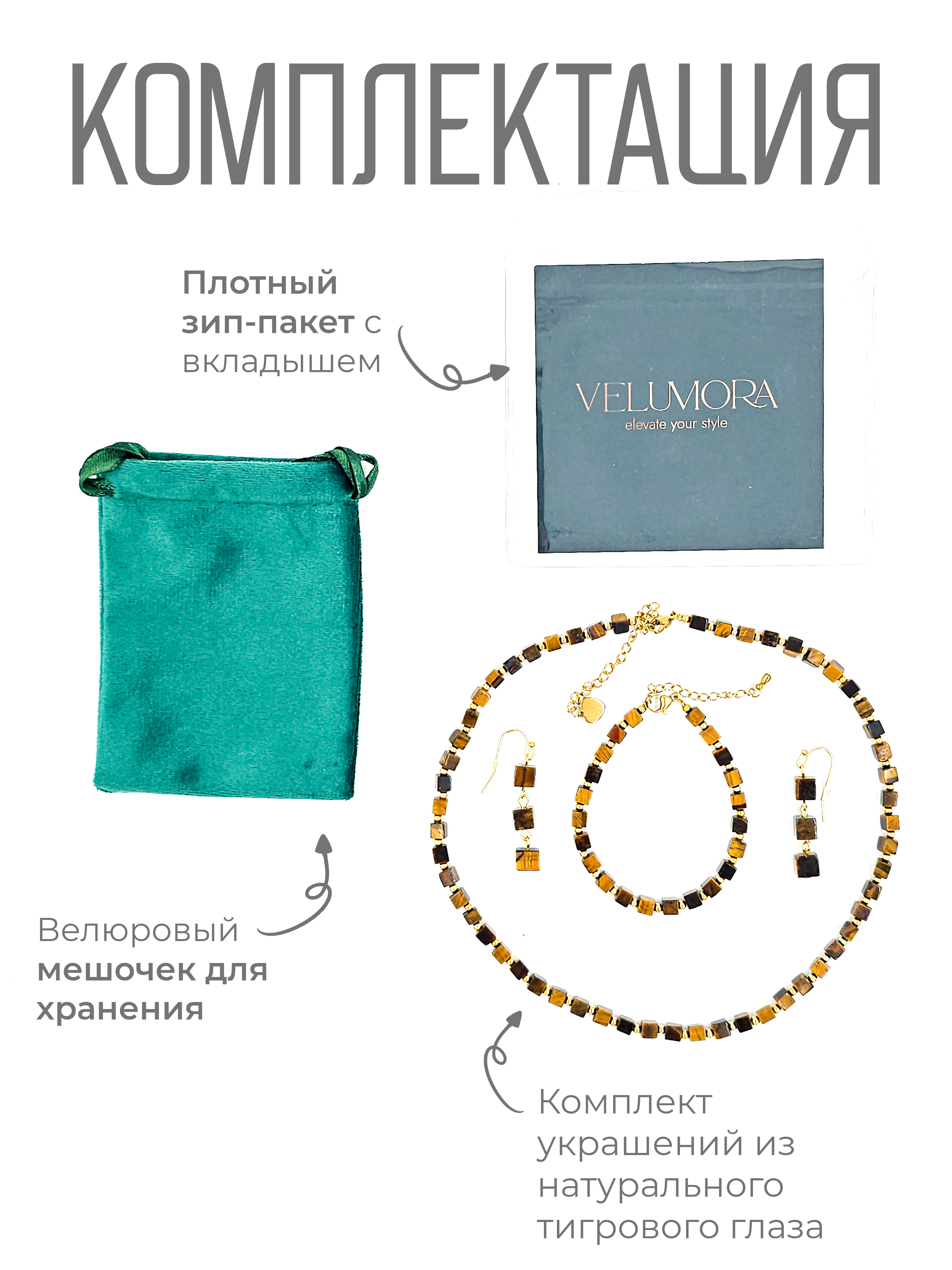 Комплект украшений тигрового глаза — стильное решение для тех, кто хочет сразу получить готовое сочетание аксессуаров в одном дизайне. В набор входят чокер, браслет и серьги, поэтому вам не нужно подбирать украшения по отдельности: комплект уже выполнен в едином стиле и гармонично смотрится в образе. Кубические бусины тигрового глаза красиво сочетаются с позолоченными вставками фурнитуры, создавая выразительный, аккуратный и современный акцент. Чокер длиной 40 см с удлинителем 7 см удобно регулируется по посадке. Браслет размером 15 см дополнен цепочкой-удлинителем 3,5 см, а серьги длиной 4 см эффектно завершают комплект. Декоративные элементы из тигрового глаза подчеркиваются спайсерами 3 мм, а общий вес комплекта 27 г делает набор комфортным для носки. Тигровый глаз ценится за красивую глубину оттенка и характерные переливы, которые особенно хорошо раскрываются при солнечном свете. От теплого сияния и живой игры камня действительно сложно оторваться. Такой комплект украшений с тигровым глазом отлично дополнит как повседневный, так и вечерний образ, добавит особый шарм и поможет выглядеть собранно и эффектно. Чокер, браслет и серьги из камня тигровый глаз подойдут тем, кто ищет женский комплект украшений, набор аксессуаров в едином стиле, украшения с позолотой и выразительный акцент для образа. Соблюдайте рекомендации по эксплуатации и уходу, и комплект долго сохранит привлекательный внешний вид.