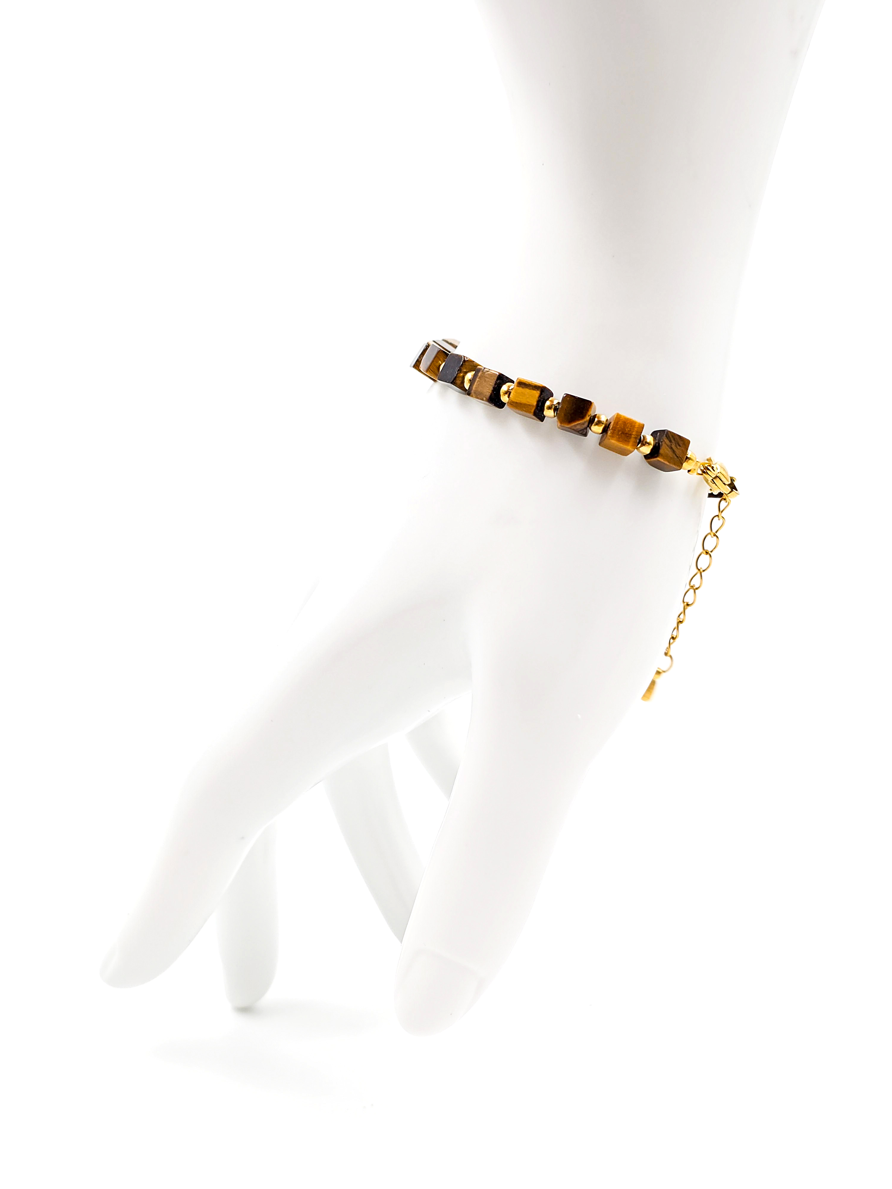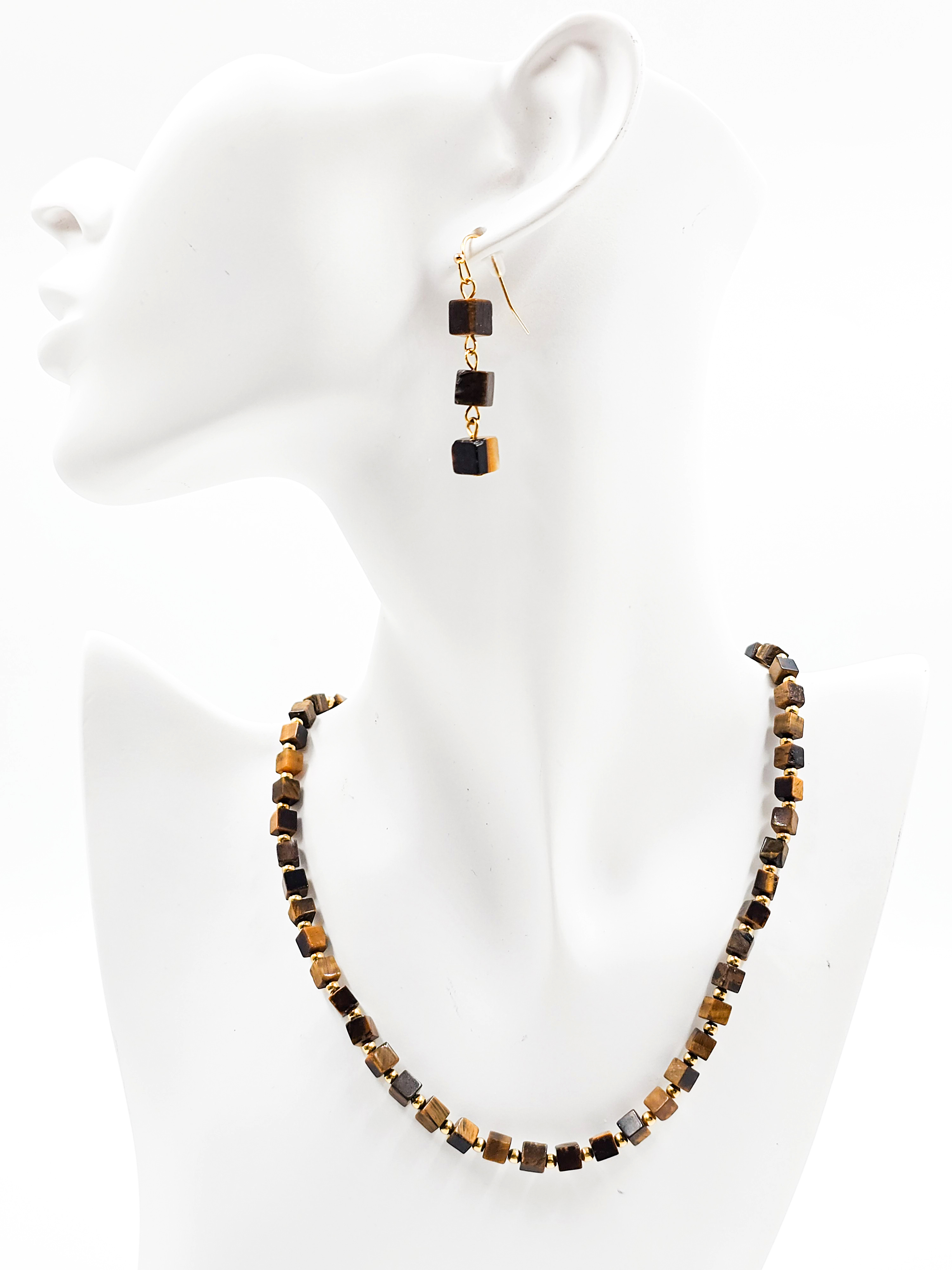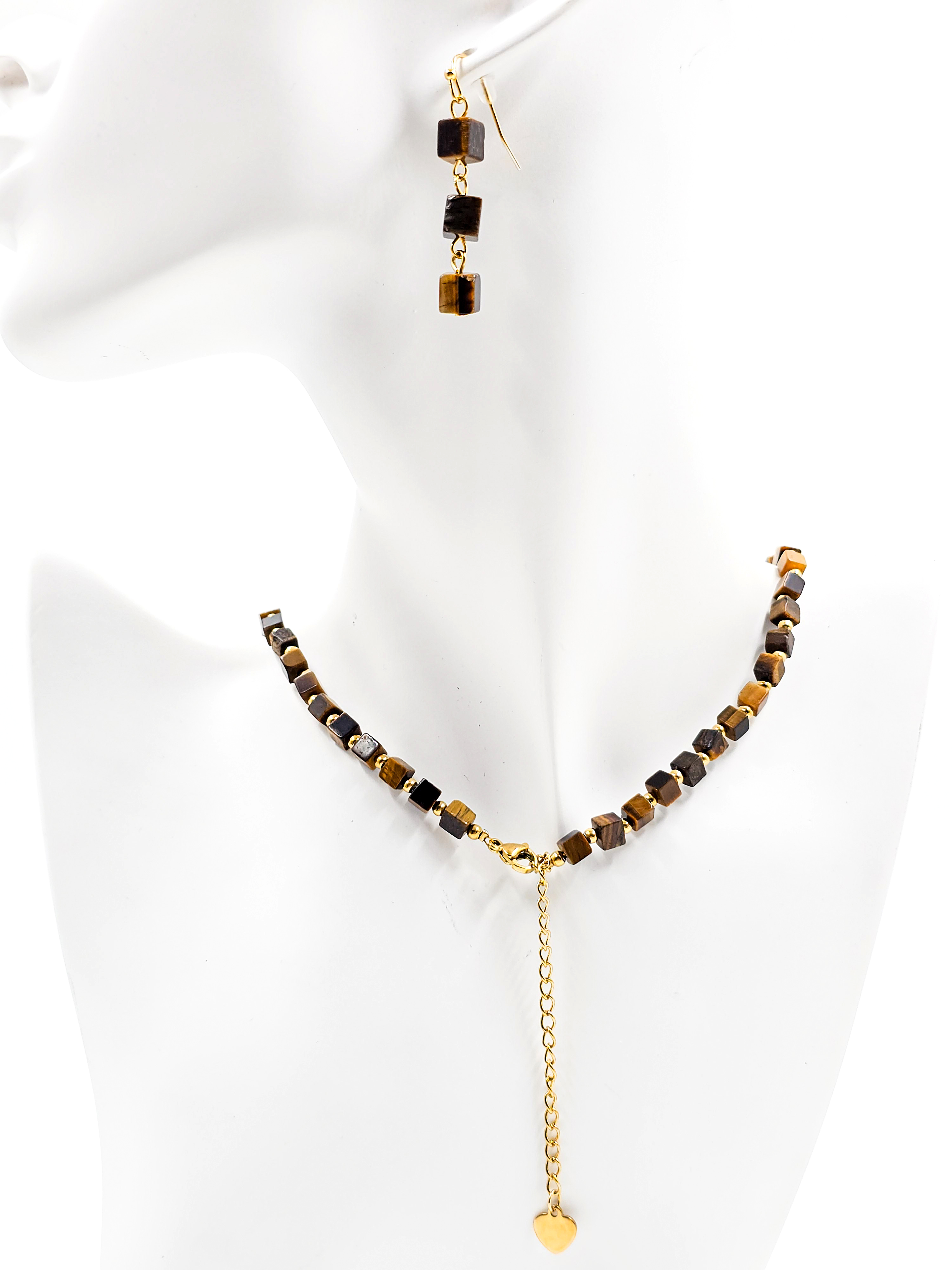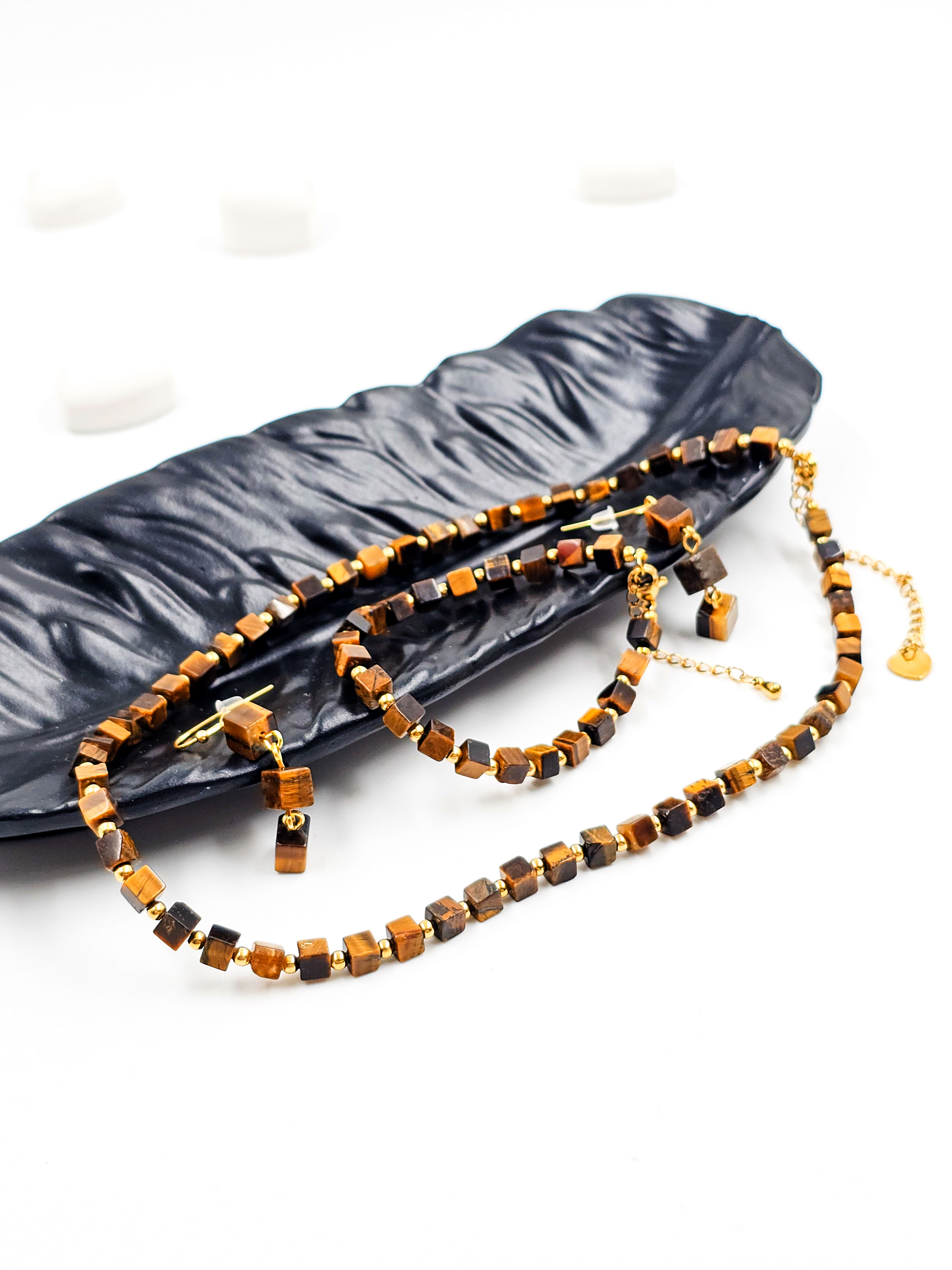 Комплект украшений тигрового глаза — стильное решение для тех, кто хочет сразу получить готовое сочетание аксессуаров в одном дизайне. В набор входят чокер, браслет и серьги, поэтому вам не нужно подбирать украшения по отдельности: комплект уже выполнен в едином стиле и гармонично смотрится в образе. Кубические бусины тигрового глаза красиво сочетаются с позолоченными вставками фурнитуры, создавая выразительный, аккуратный и современный акцент. Чокер длиной 40 см с удлинителем 7 см удобно регулируется по посадке. Браслет размером 15 см дополнен цепочкой-удлинителем 3,5 см, а серьги длиной 4 см эффектно завершают комплект. Декоративные элементы из тигрового глаза подчеркиваются спайсерами 3 мм, а общий вес комплекта 27 г делает набор комфортным для носки. Тигровый глаз ценится за красивую глубину оттенка и характерные переливы, которые особенно хорошо раскрываются при солнечном свете. От теплого сияния и живой игры камня действительно сложно оторваться. Такой комплект украшений с тигровым глазом отлично дополнит как повседневный, так и вечерний образ, добавит особый шарм и поможет выглядеть собранно и эффектно. Чокер, браслет и серьги из камня тигровый глаз подойдут тем, кто ищет женский комплект украшений, набор аксессуаров в едином стиле, украшения с позолотой и выразительный акцент для образа. Соблюдайте рекомендации по эксплуатации и уходу, и комплект долго сохранит привлекательный внешний вид.