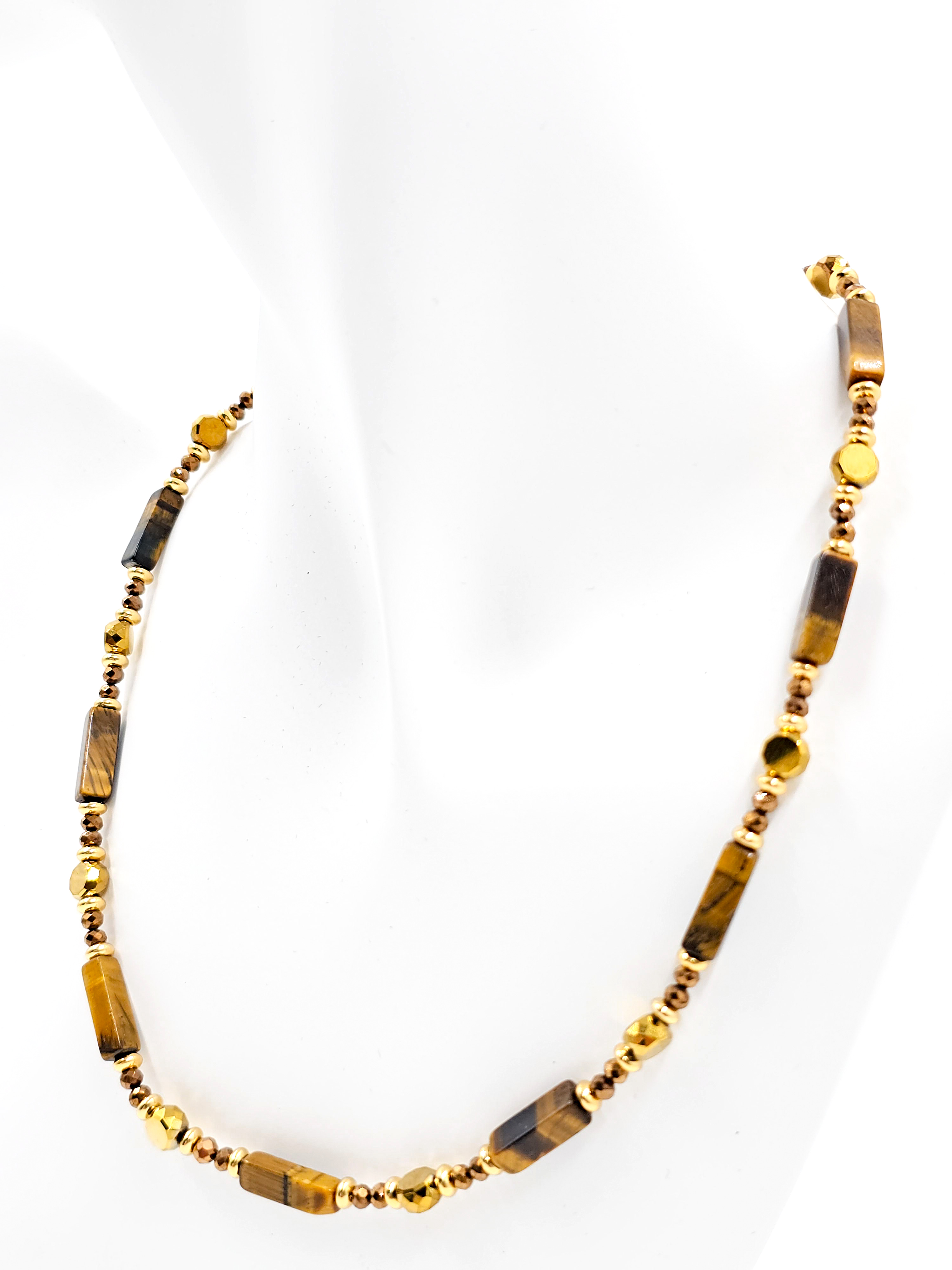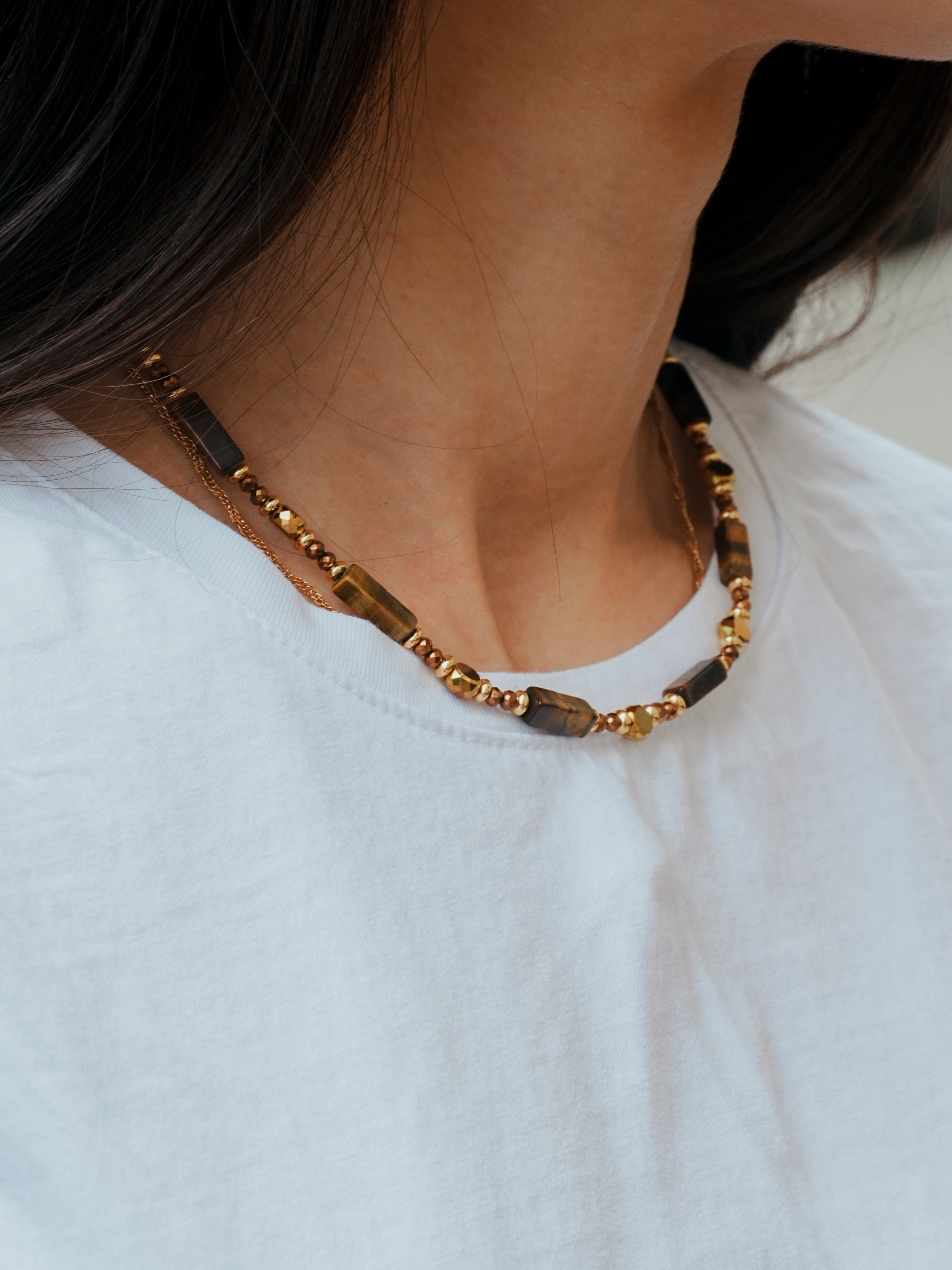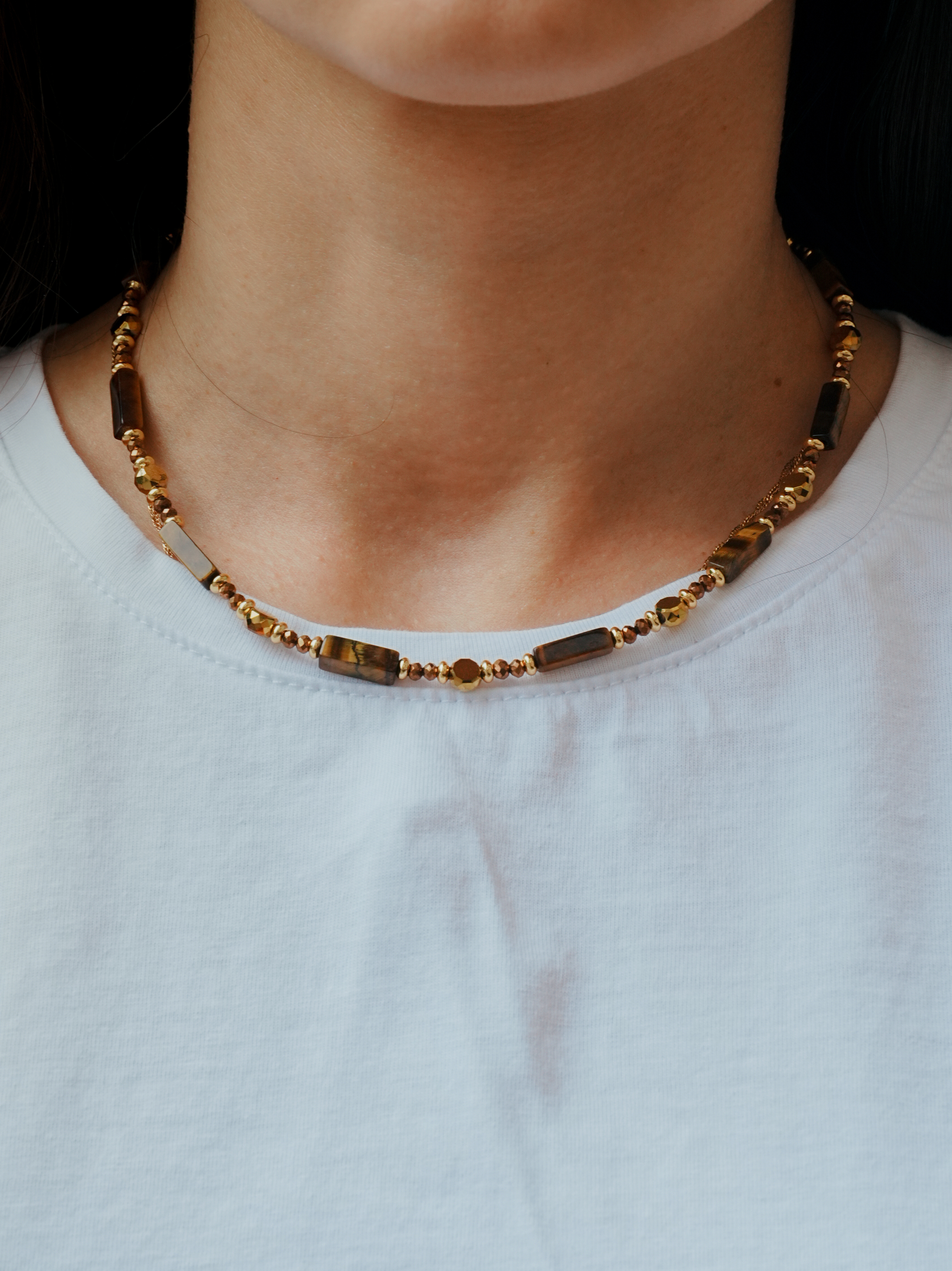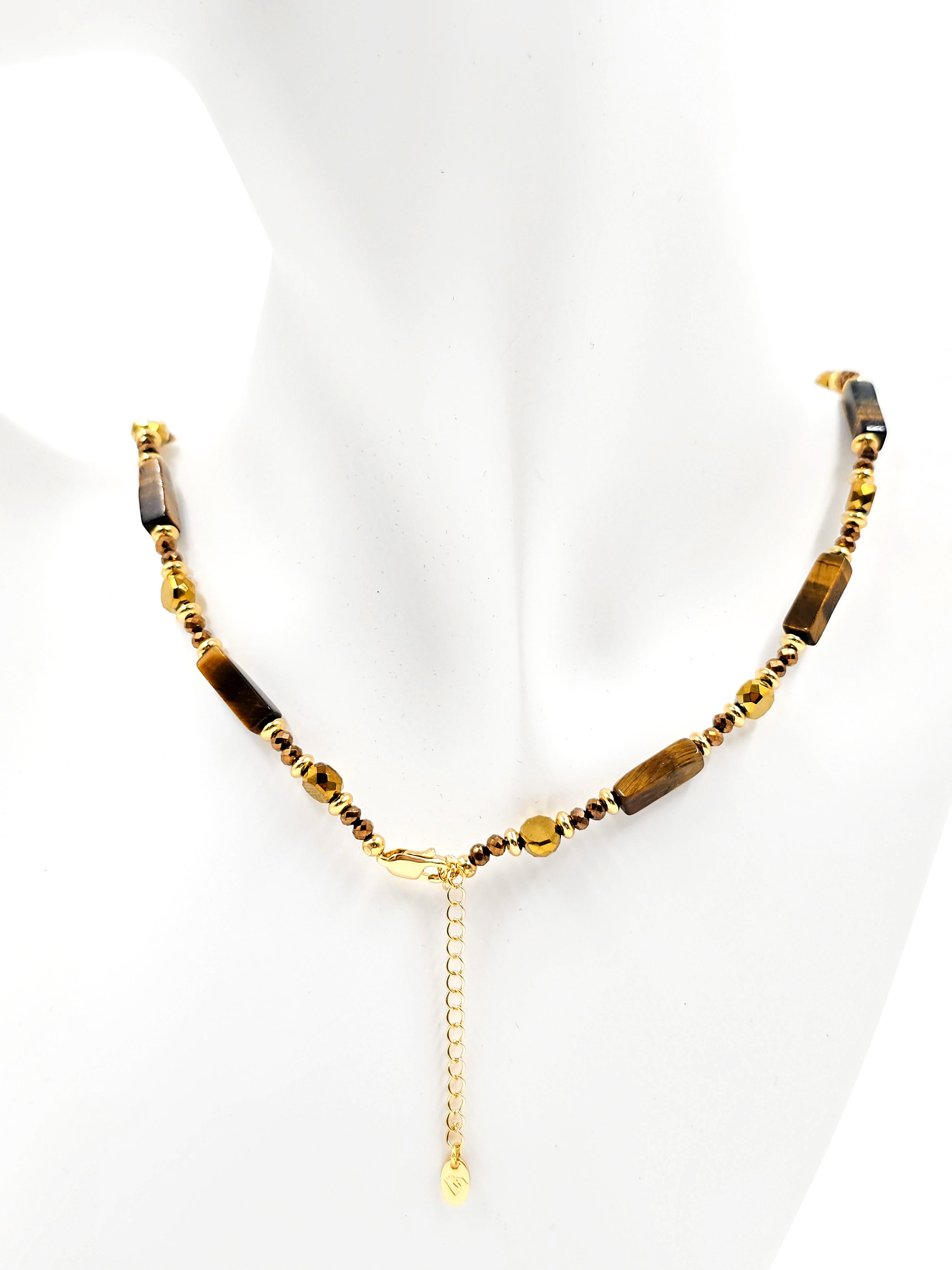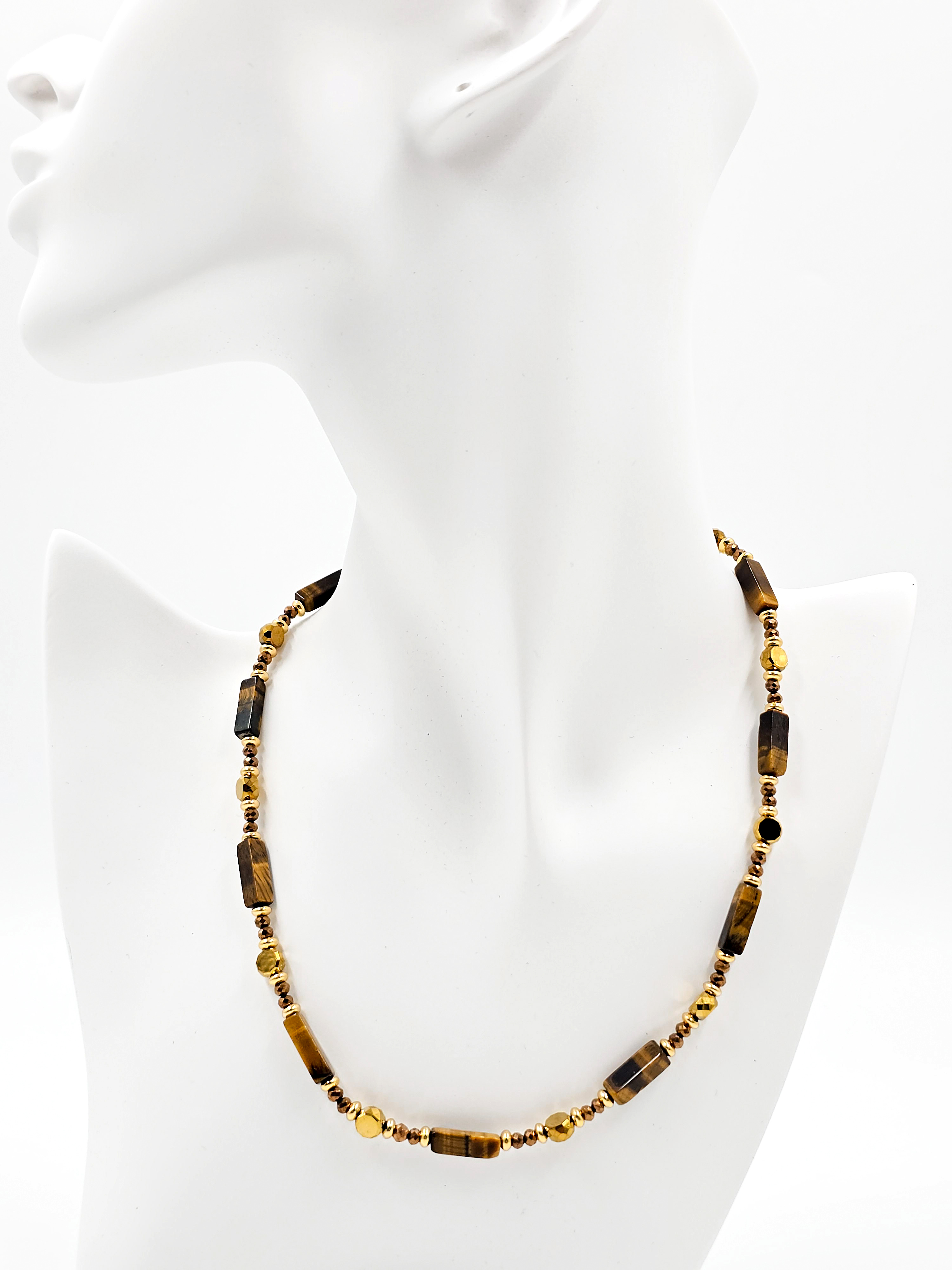 Чокер из натурального камня тигровый глаз — стильное украшение, в котором гармонично сочетаются сила природы, ручная работа и современные акценты. Дизайнерские бусы собраны вручную мастерами, где каждый элемент — результат кропотливого труда. Прямоугольные бусины из тигрового глаза изготавливаются вручную, как и кубические формы, и требуют повышенного внимания на этапе шлифовки и сверления. Они не имеют идеальной геометрии, но именно это придаёт украшению уникальный, живой характер.