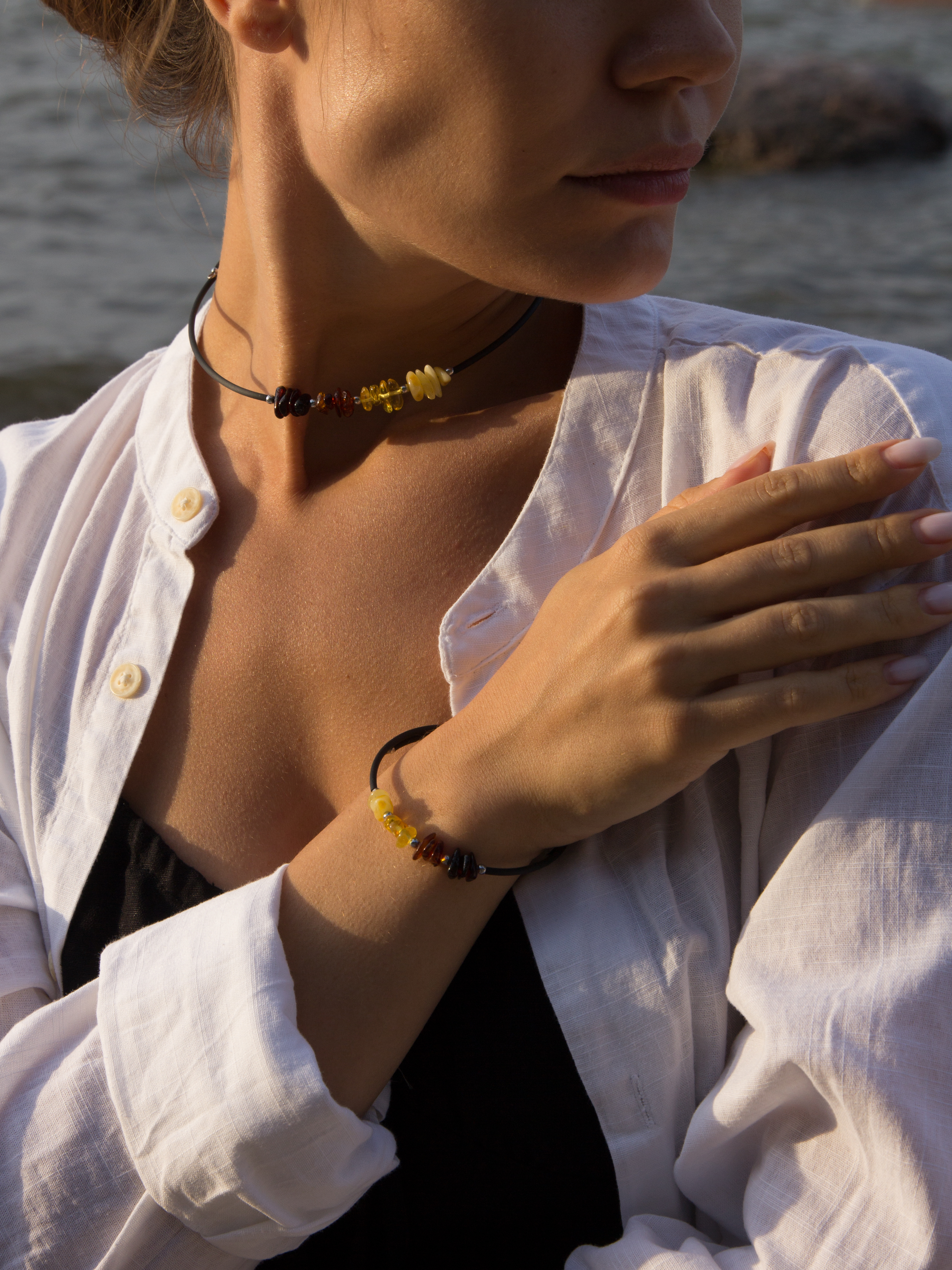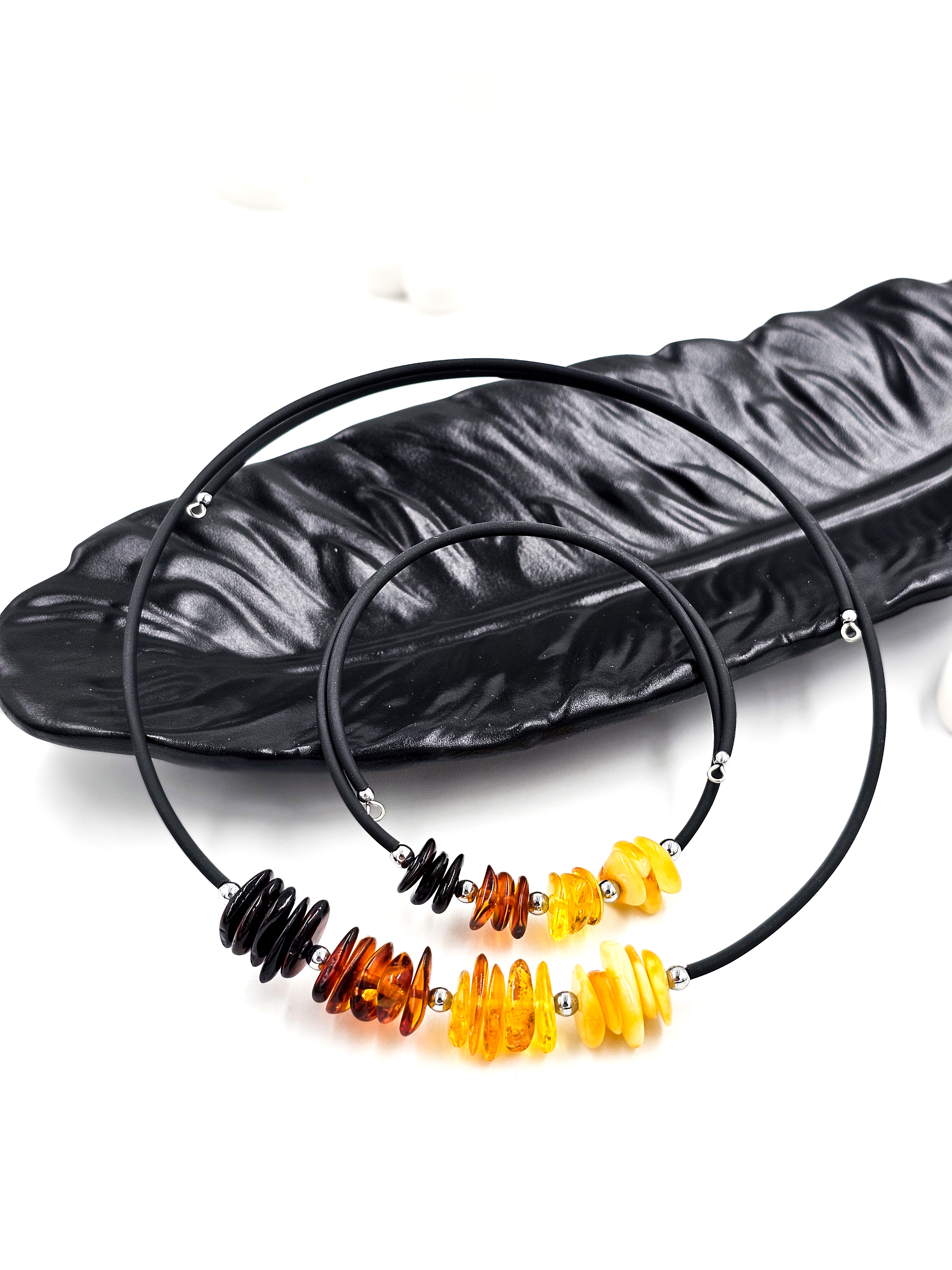 Представляем вашему вниманию роскошный комплект янтарных украшений, состоящий из чокера-колье и браслета, созданных из натурального цельного янтаря. Этот янтарный набор представляет собой настоящее произведение ювелирного искусства, где каждый элемент тщательно подобран и обработан вручную опытными мастерами. Особенность этого комплекта заключается в уникальной технике сборки на стальной гипоаллергенной мемори-проволоке с использованием каучука, что обеспечивает не только надежность конструкции, но и комфорт при носке. Янтарные камни, прошедшие шлифовку и полировку, создают удивительную игру света, демонстрируя всю красоту природного янтаря. Чокер-колье элегантно обрамляет шею, а его регулируемая длина позволяет найти идеальное положение украшения. Браслет, дополненный изящными вставками из натурального гематита, создает гармоничный ансамбль с чокером. Размеры янтарных камней варьируются от 6 до 10 миллиметров, что создает объемную и динамичную композицию. Этот янтарный комплект не только украсит свою обладательницу, но и принесет пользу здоровью. Янтарь издревле славится своими целебными свойствами, особенно благотворно влияя на щитовидную железу и общее самочувствие. Регулярное ношение янтарных украшений способствует улучшению иммунитета и эмоционального состояния. Природная уникальность каждого янтарного камня делает каждый комплект неповторимым. Незначительные различия в форме и оттенках лишь подчеркивают аутентичность и индивидуальность украшений, делая их особенно ценными для истинных ценителей природной красоты. Приобретая этот янтарный комплект, вы становитесь обладательницей не просто украшений, а настоящего сокровища, способного подчеркнуть вашу индивидуальность и стать источником здоровья и благополучия.
