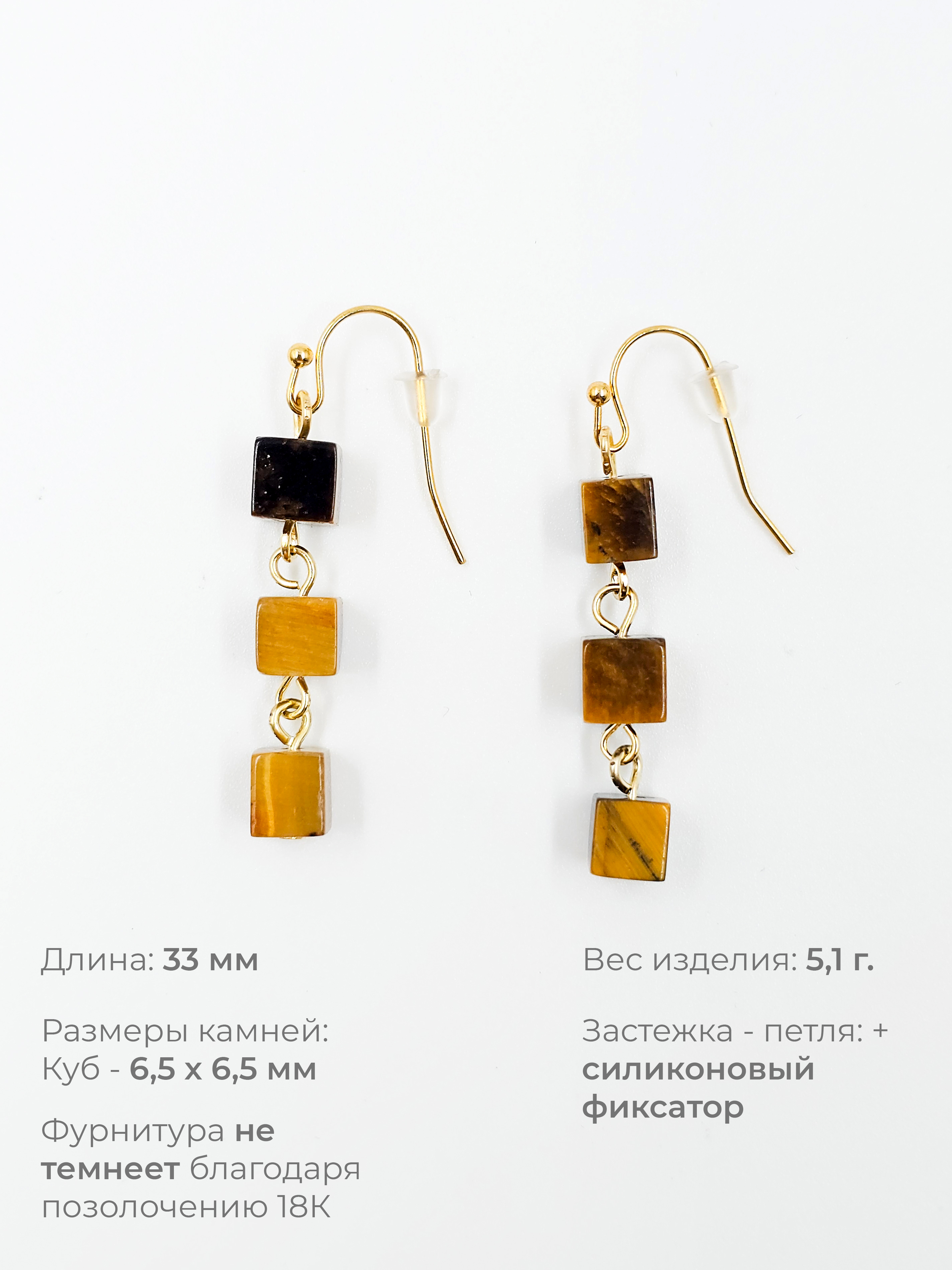 Длина серёг составляет 33 мм, что делает их универсальными: они подчёркивают линию шеи, но остаются лёгкими и комфортными даже при длительной носке. Размер камней-кубов — 6,5 × 6,5 мм, их блеск и естественные переливы создают эффектный акцент, не перегружая образ.