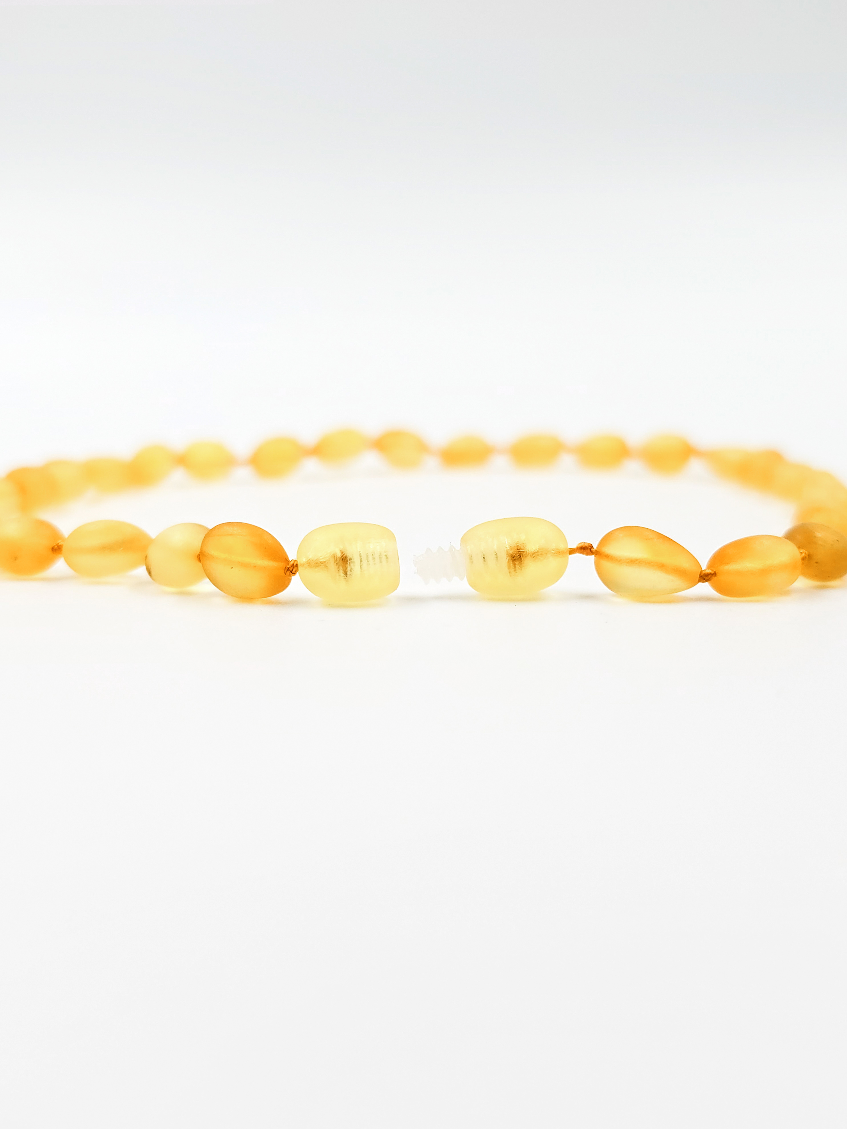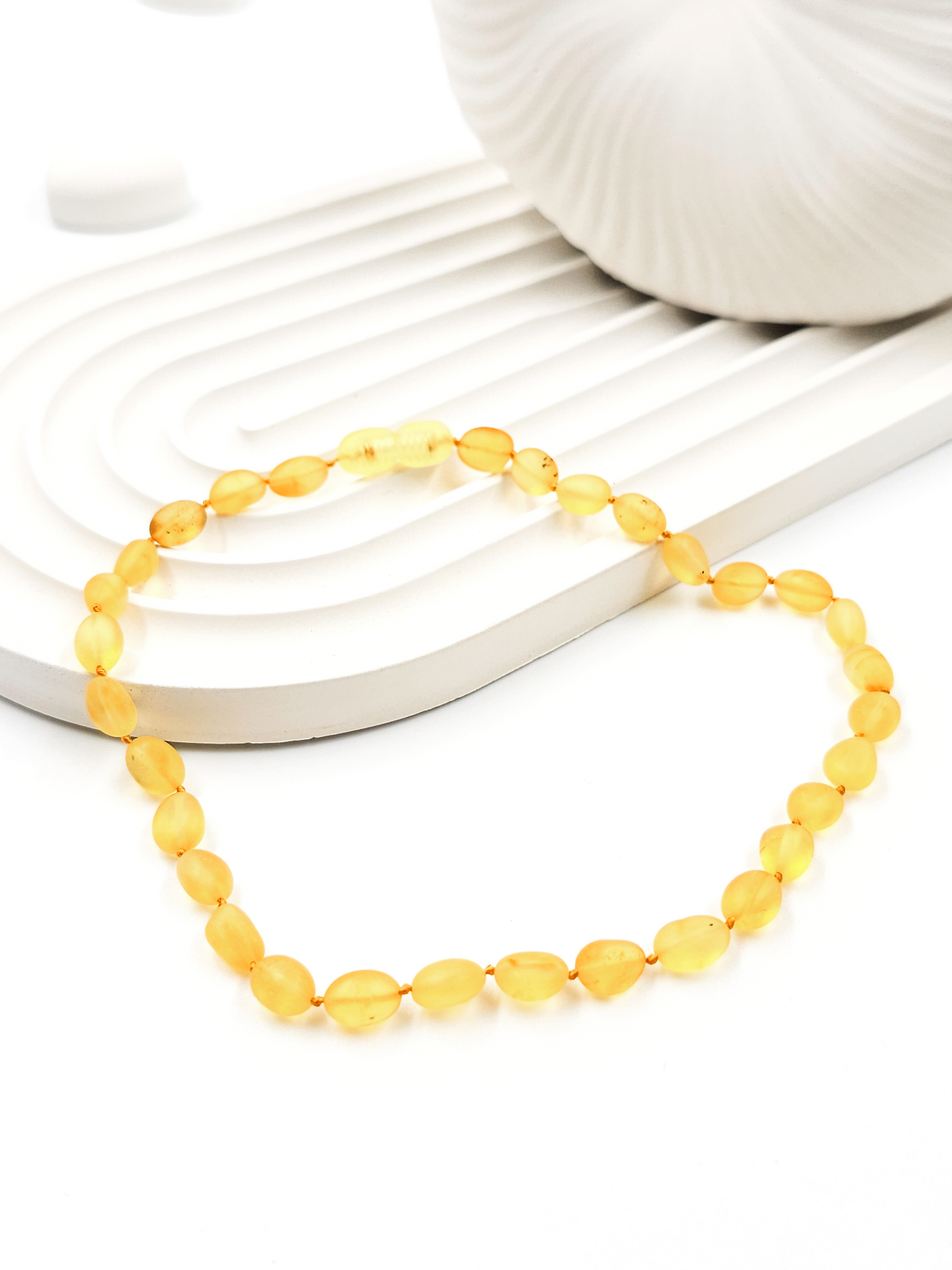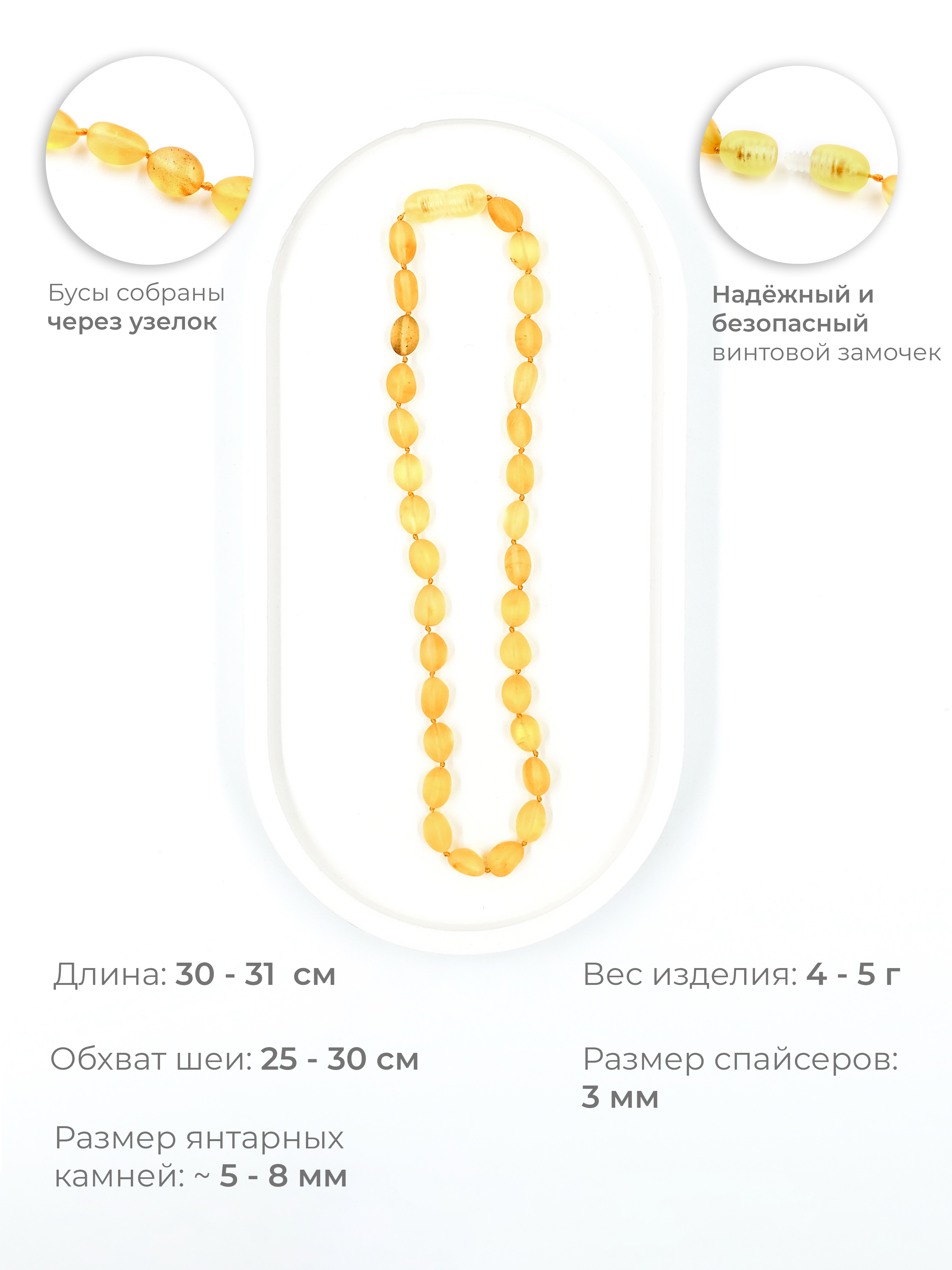 Камни имеют матовую поверхность, так как проходят только процесс шлифовки, без полировки. Это сохраняет их естественную текстуру и благоприятную энергетику. Считается, что янтарь положительно влияет на ребёнка: он помогает снять тревожность, укрепляет иммунитет, улучшает сон и общее самочувствие. Природная энергия янтаря мягко воздействует на организм, создавая ощущение комфорта и спокойствия. Именно поэтому такие украшения часто выбирают родители, заботящиеся о балансе и гармонии своих детей.